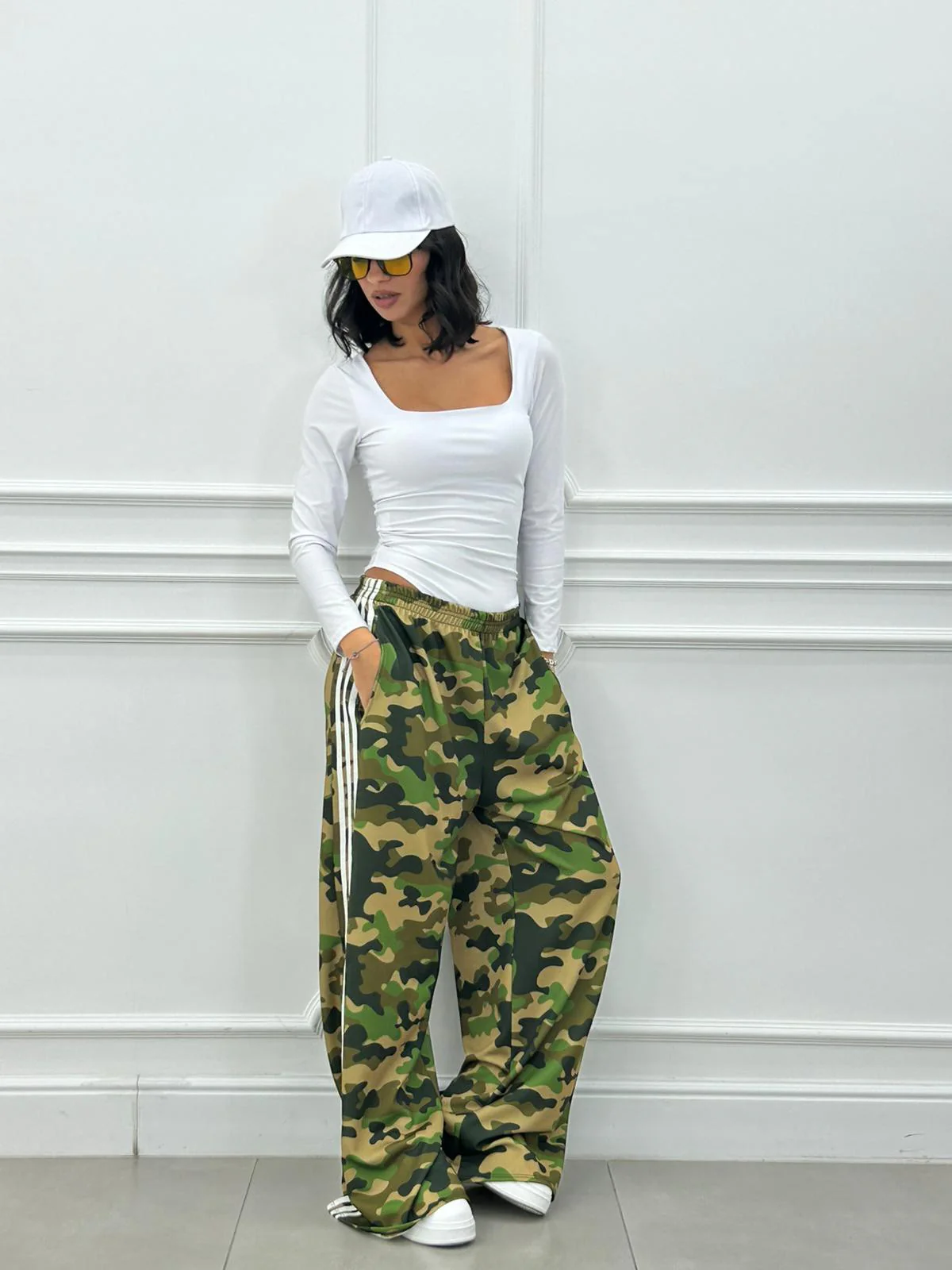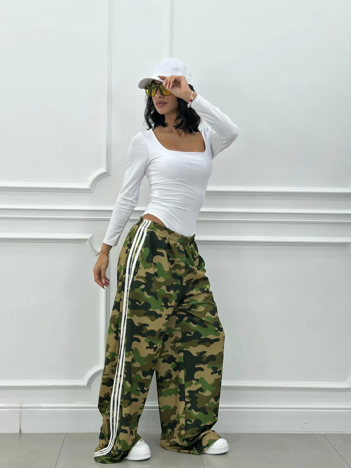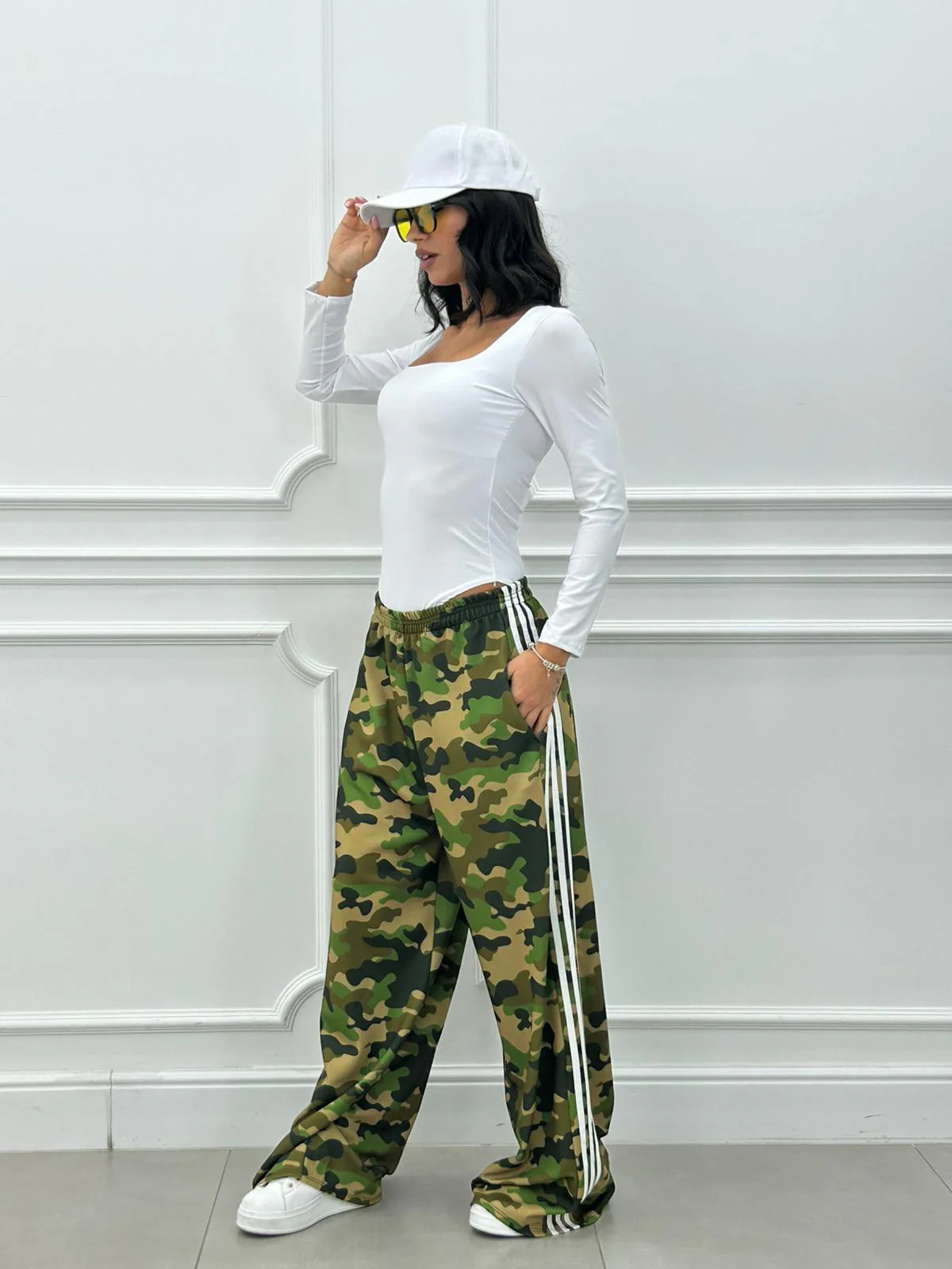 Pantalone fantasia camouflage con banda laterale , elastico in vita e tasche