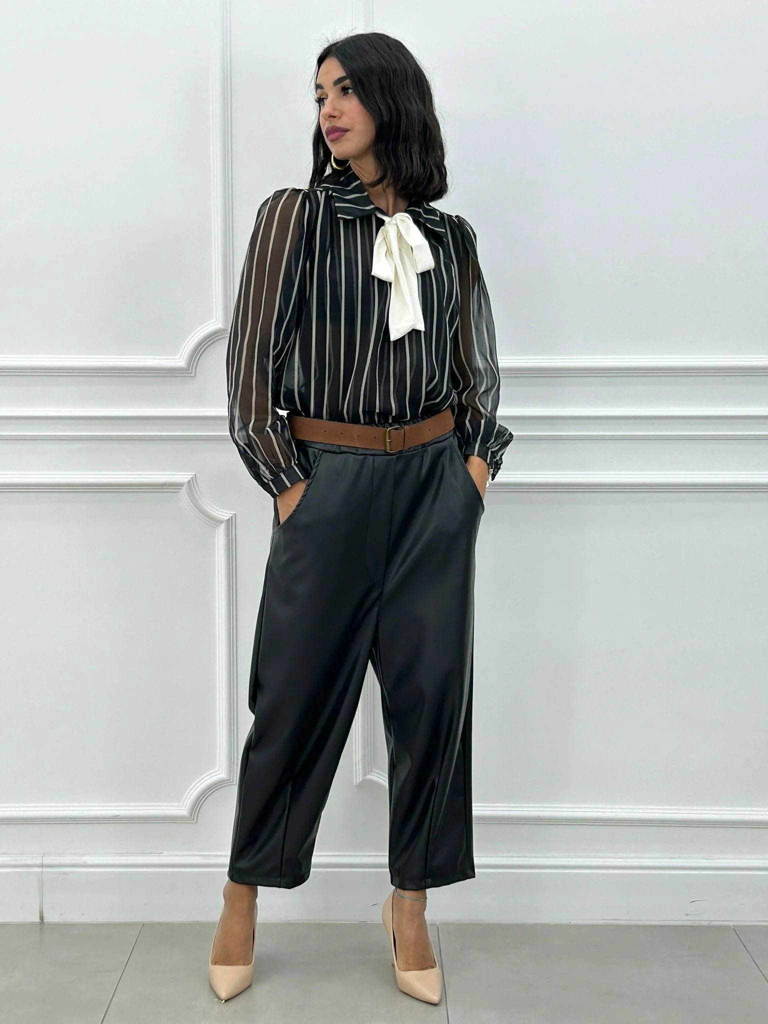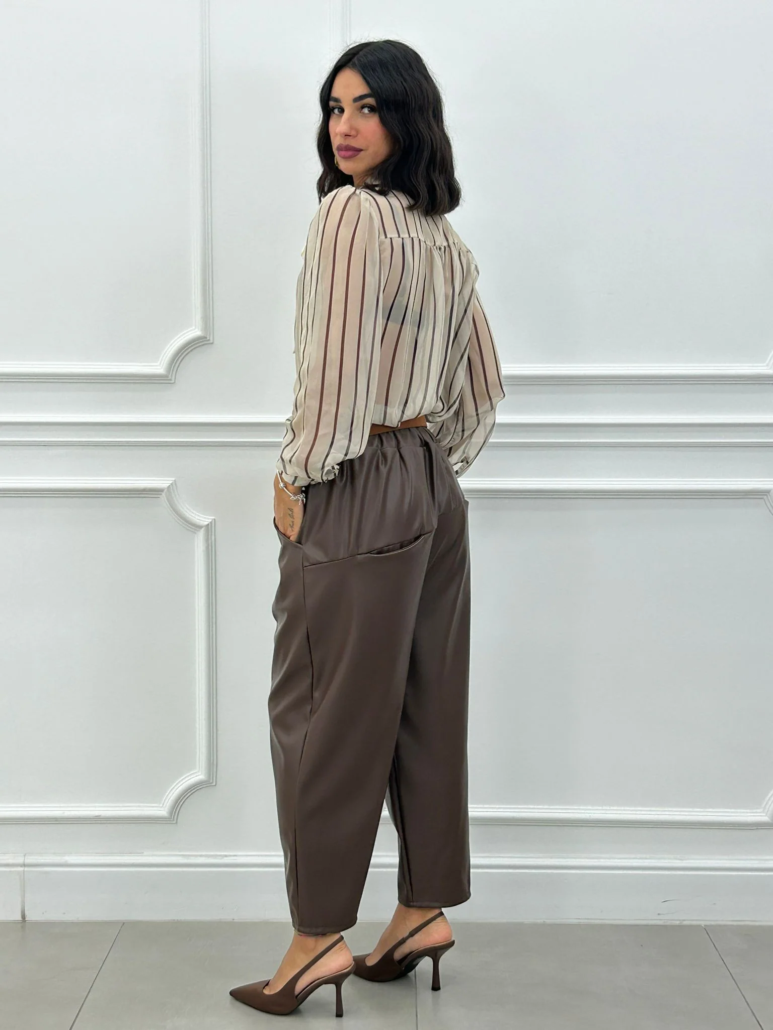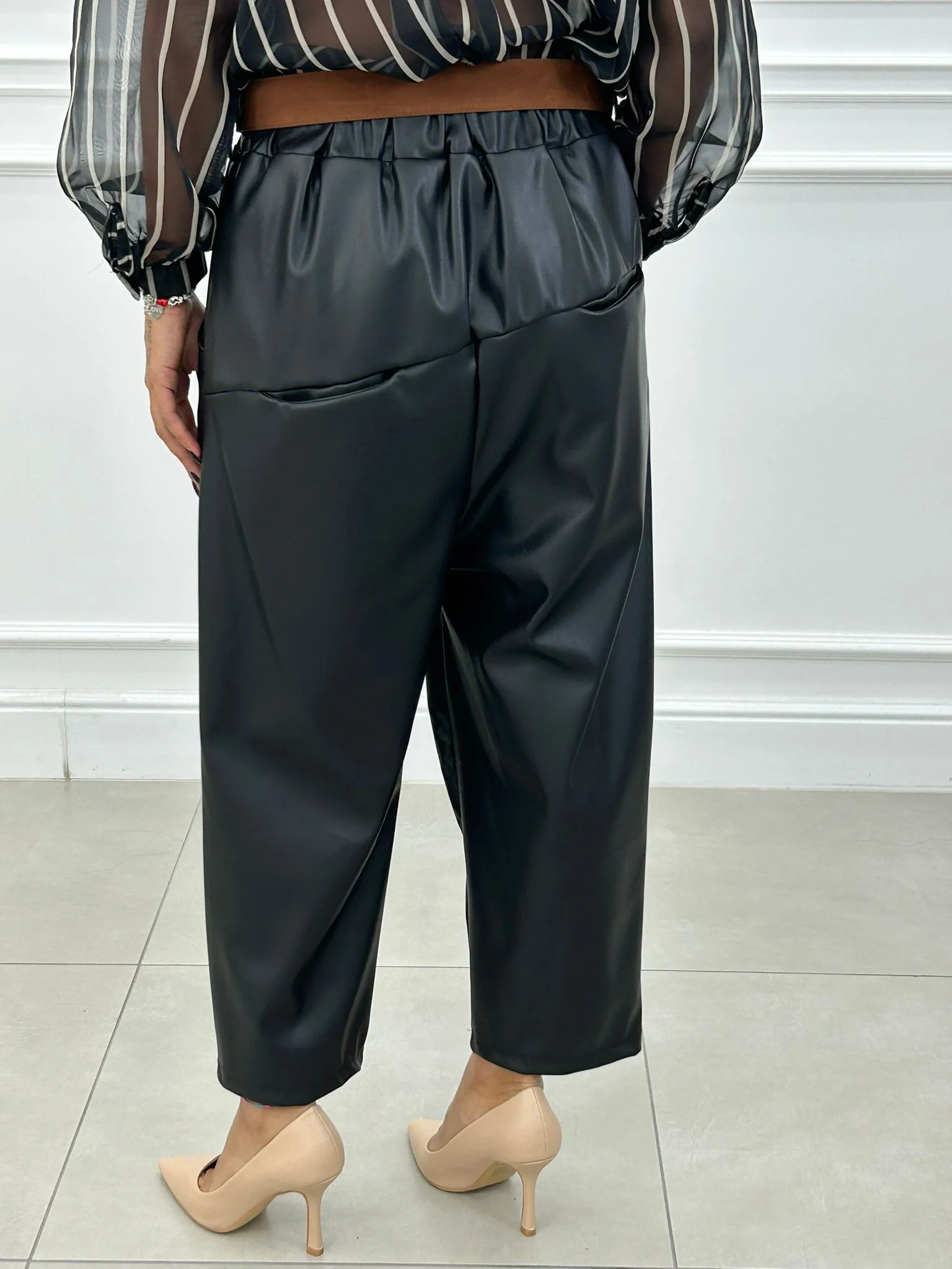Pantalone ecopelle con cintura, tasche ed elastico in vita