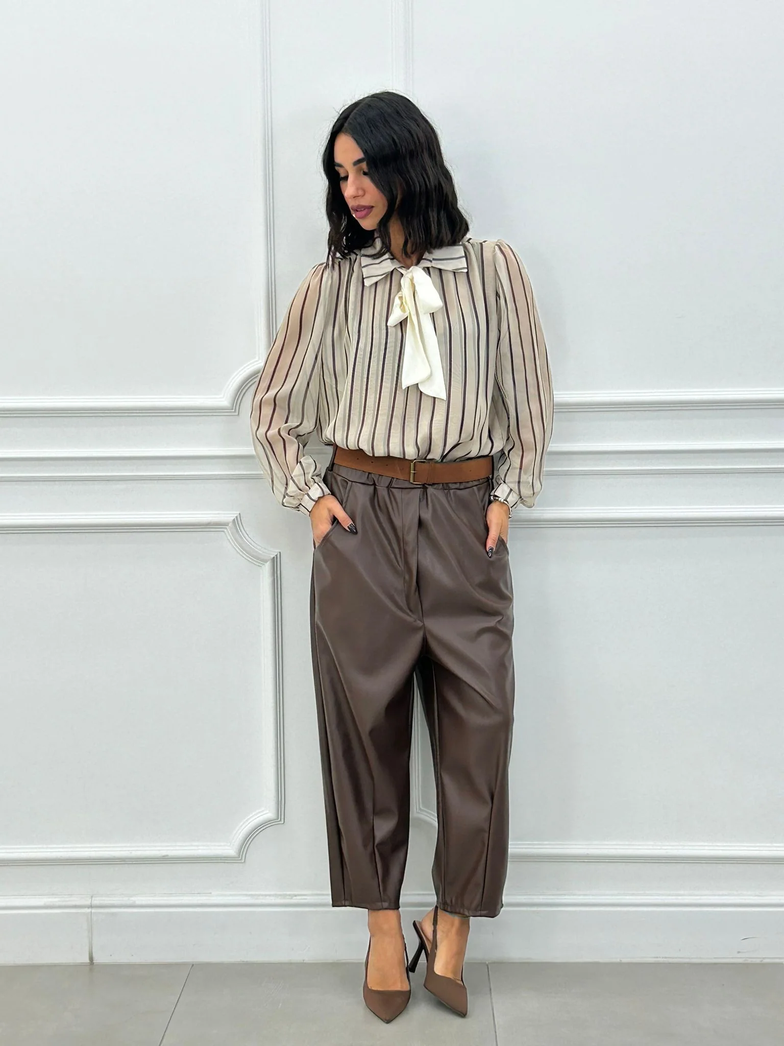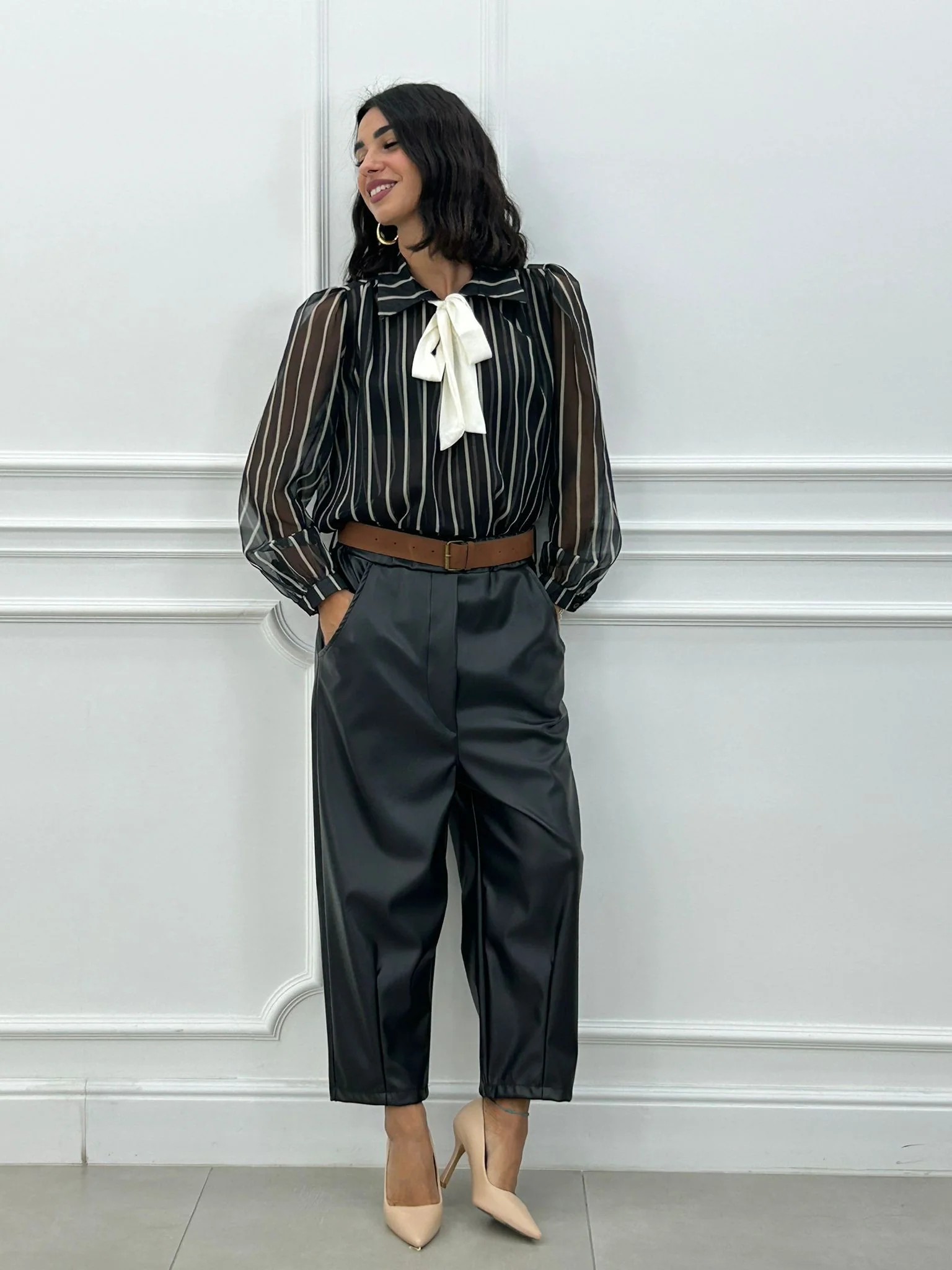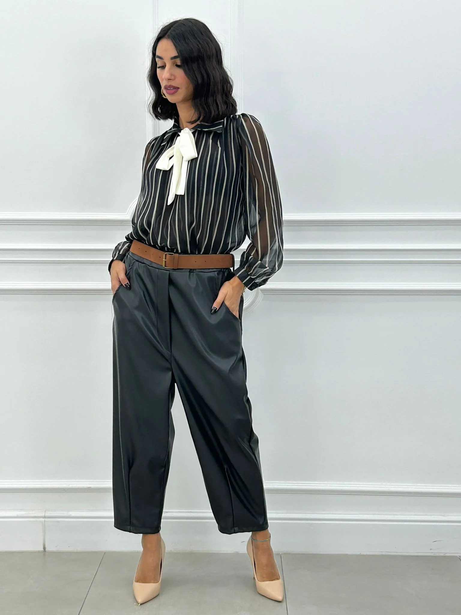 Pantalone ecopelle con cintura, tasche ed elastico in vita