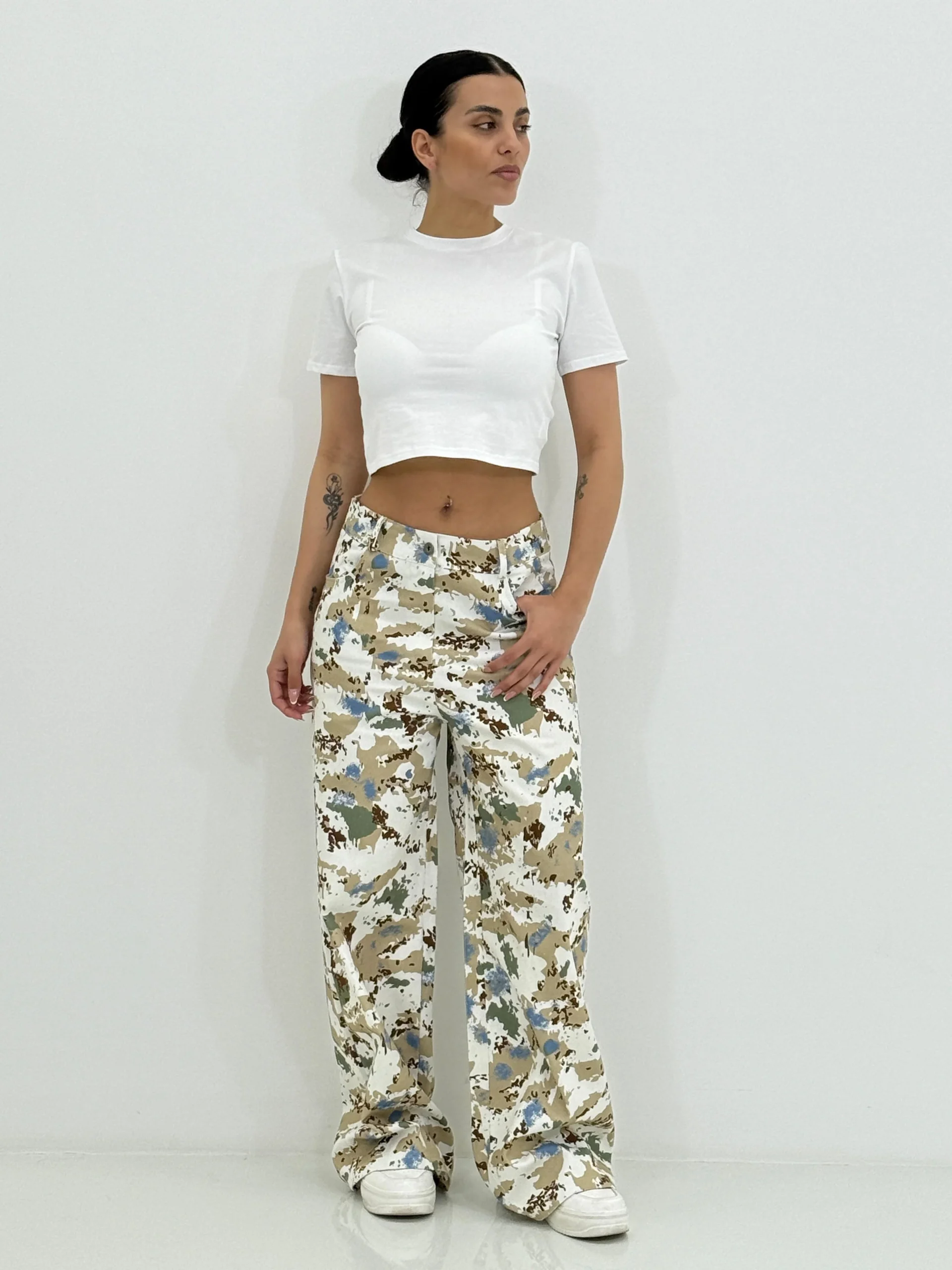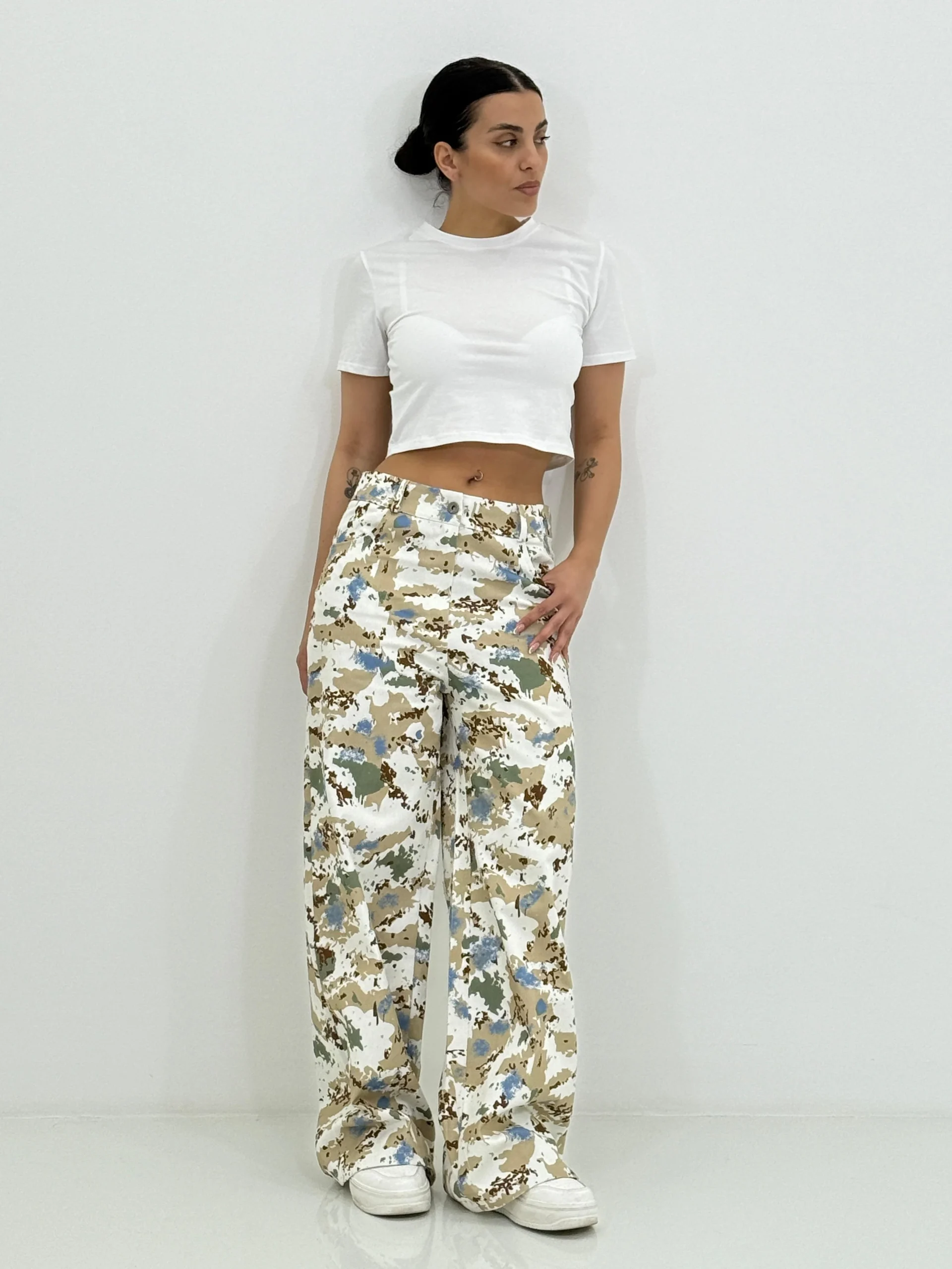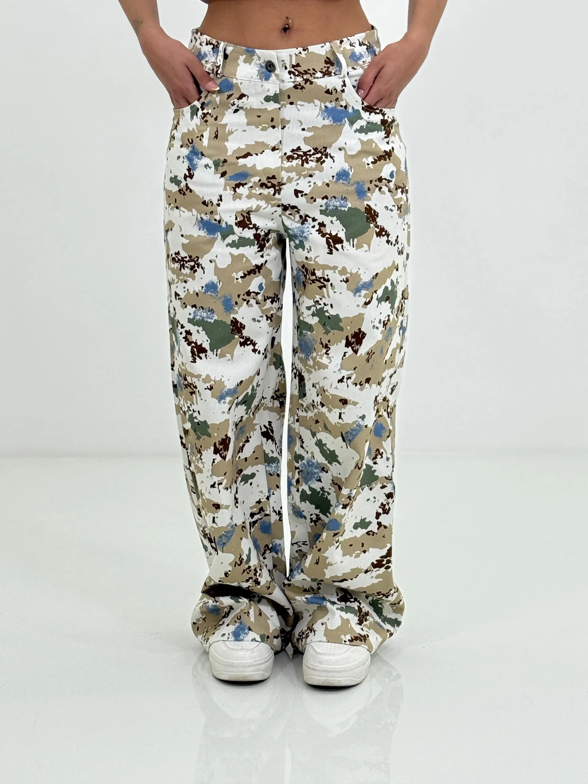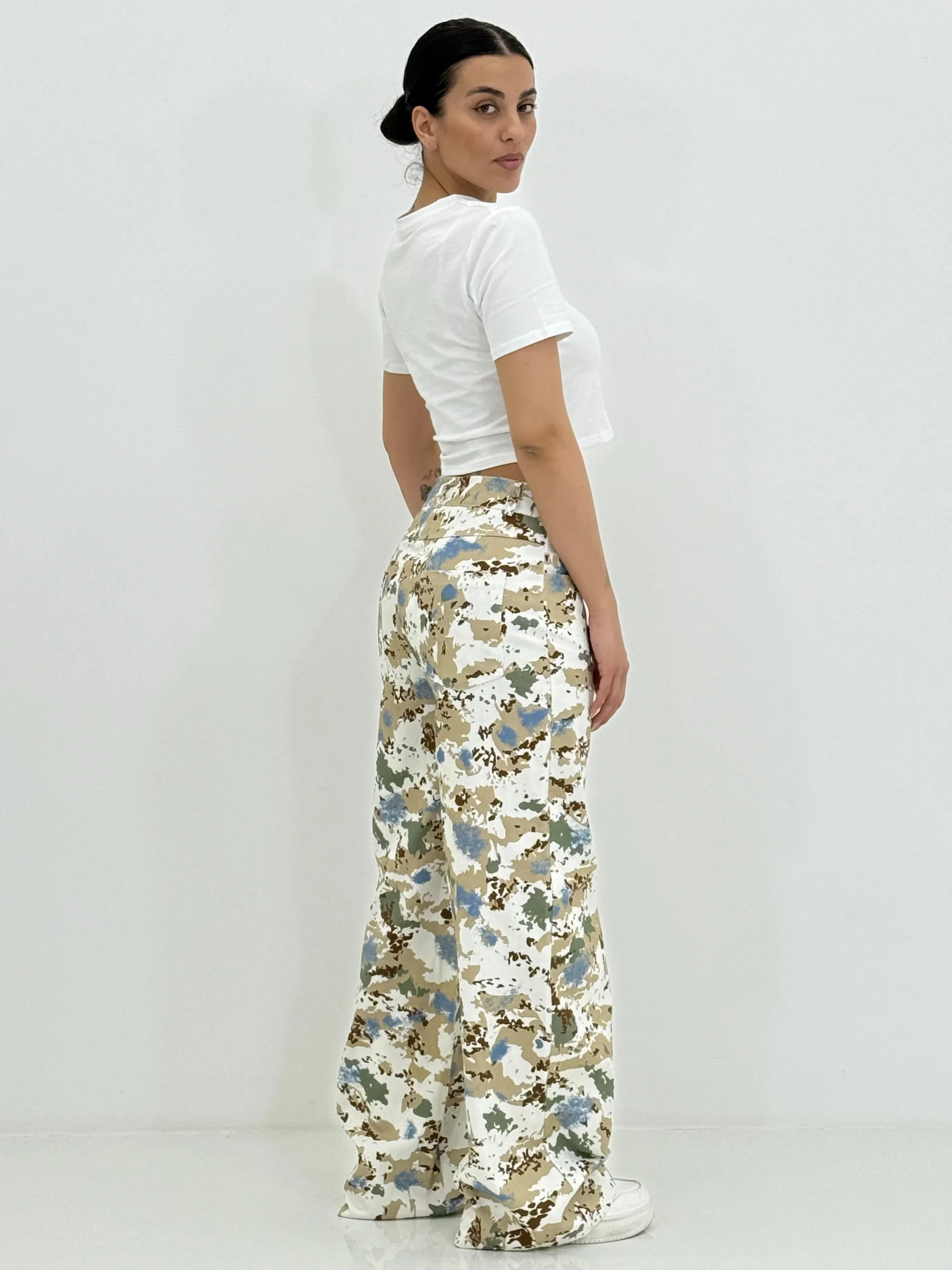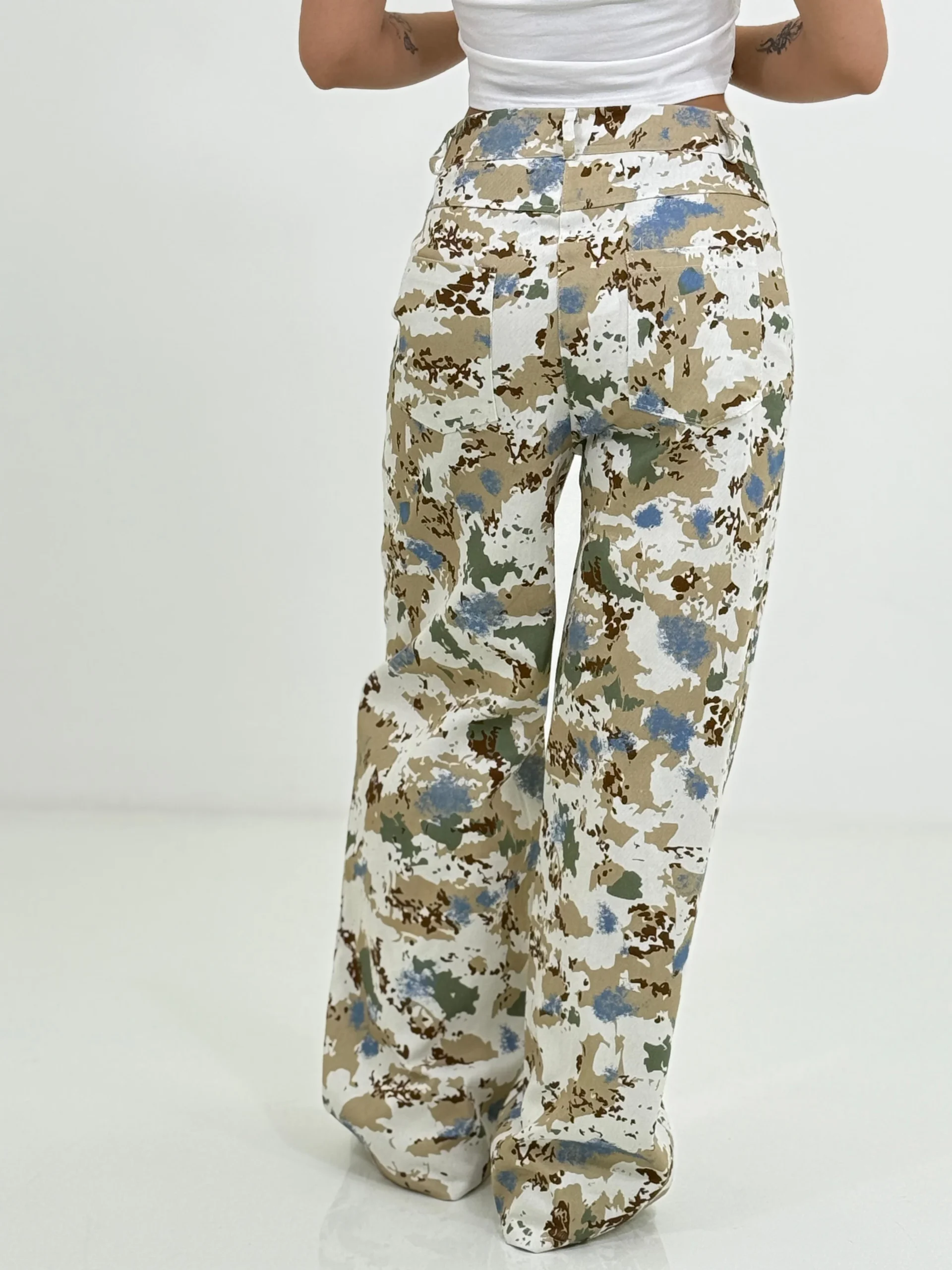 Pantalone jeansato wide leg fantasia , con tasche