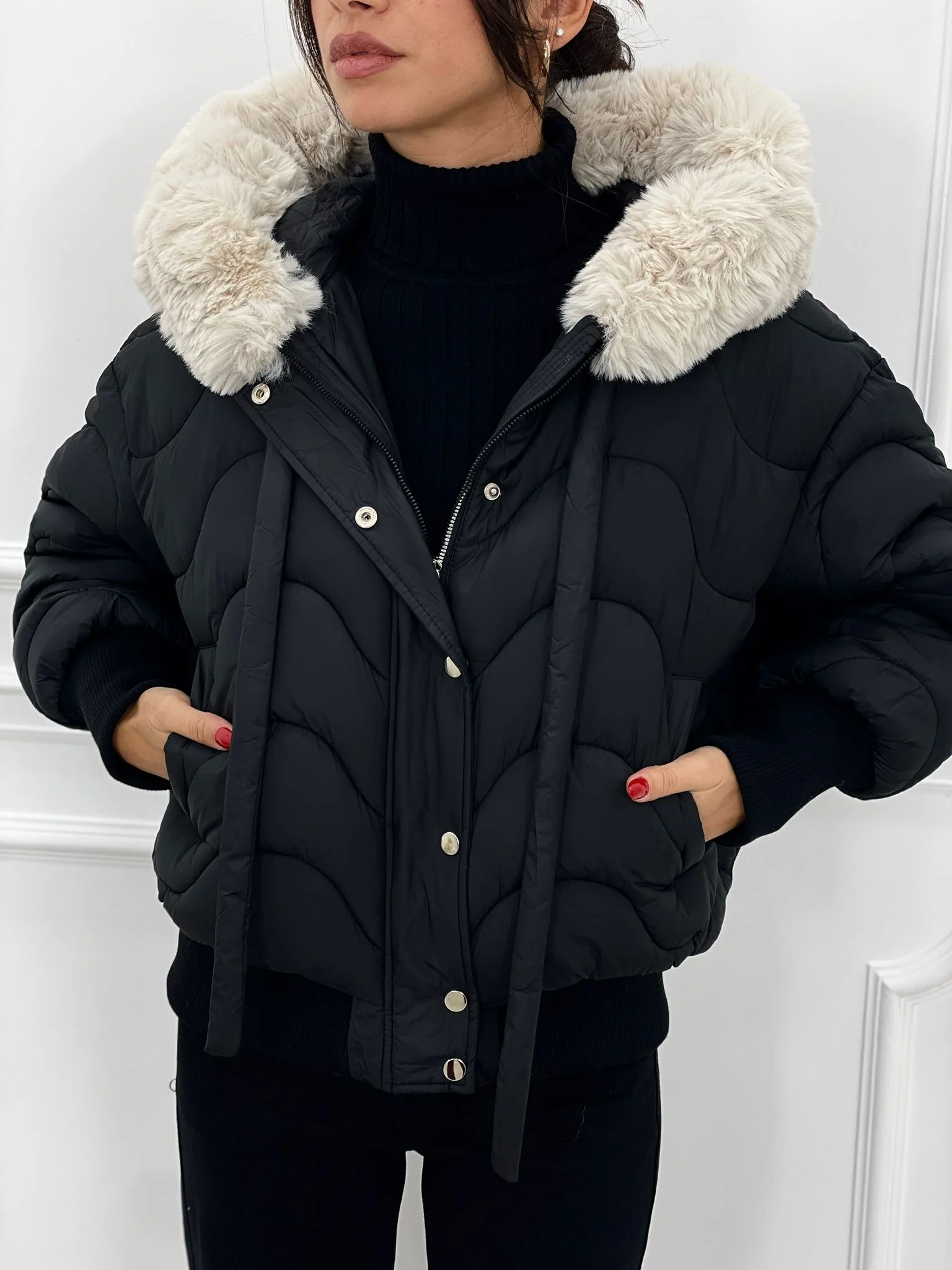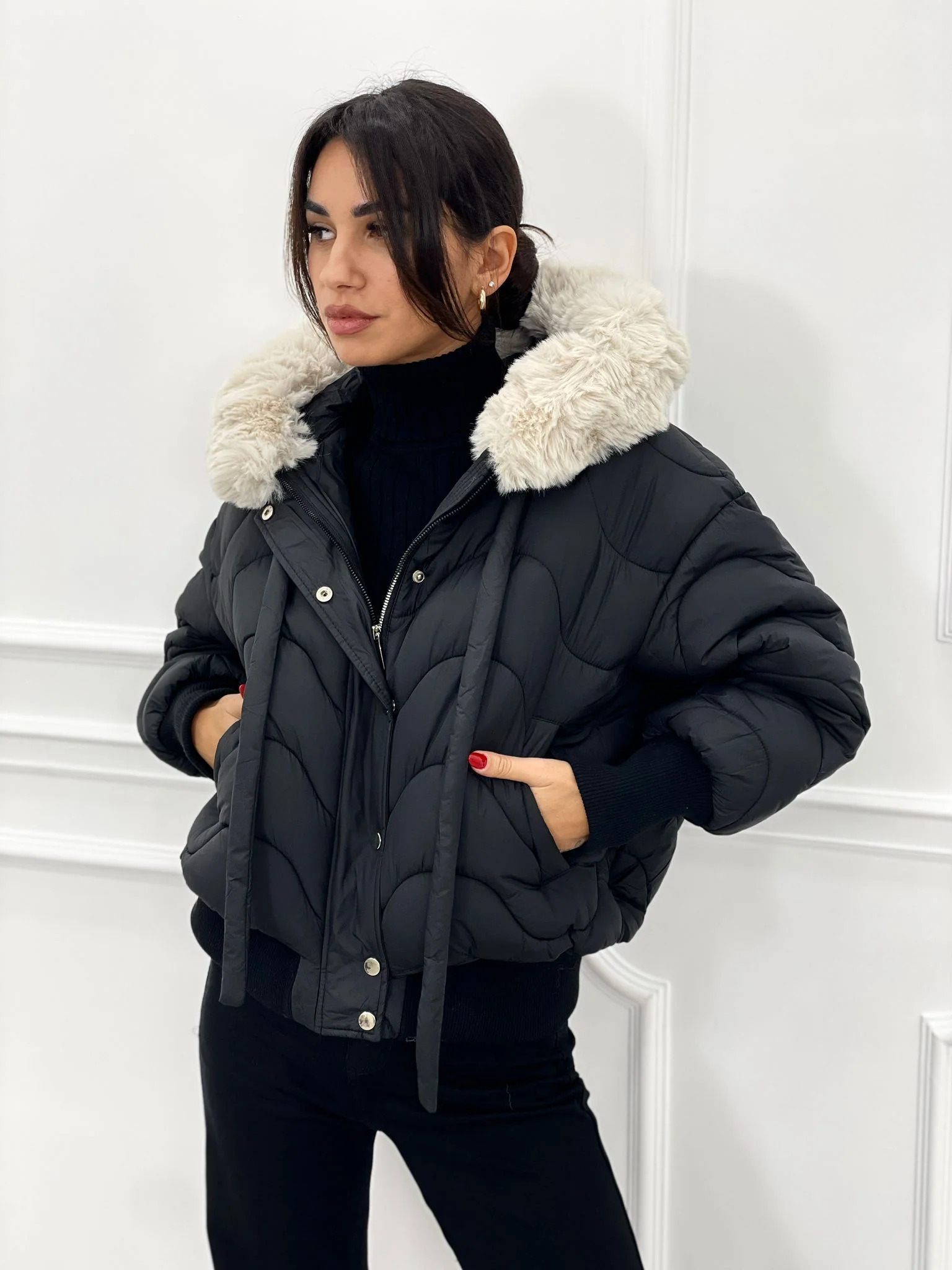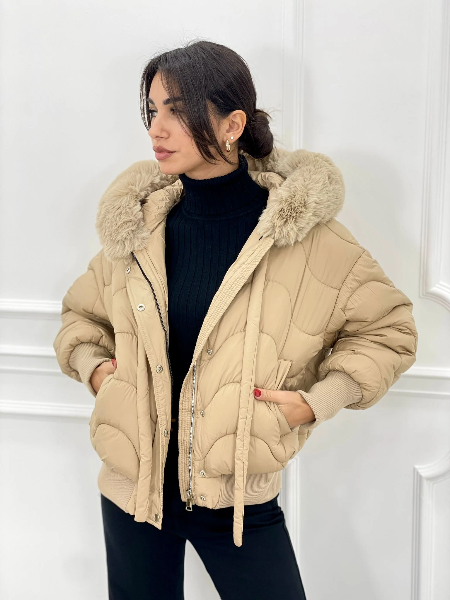 Piumino trapuntato con cappuccio in pelliccia(removibile)con tasche,chiusura zip e bottoni,interno foderato