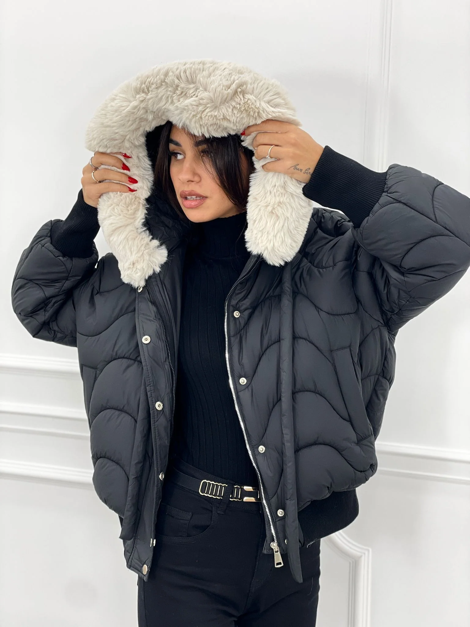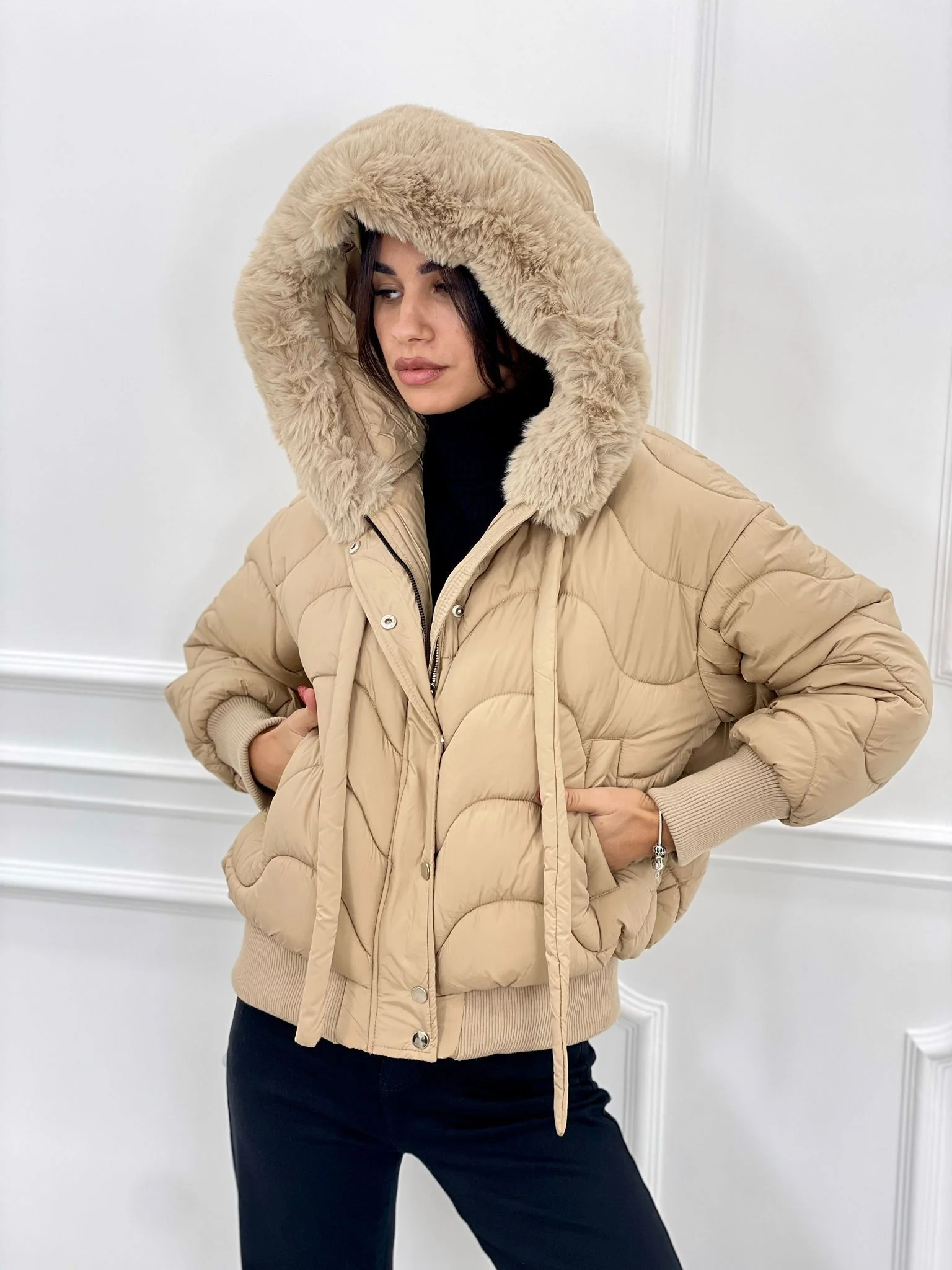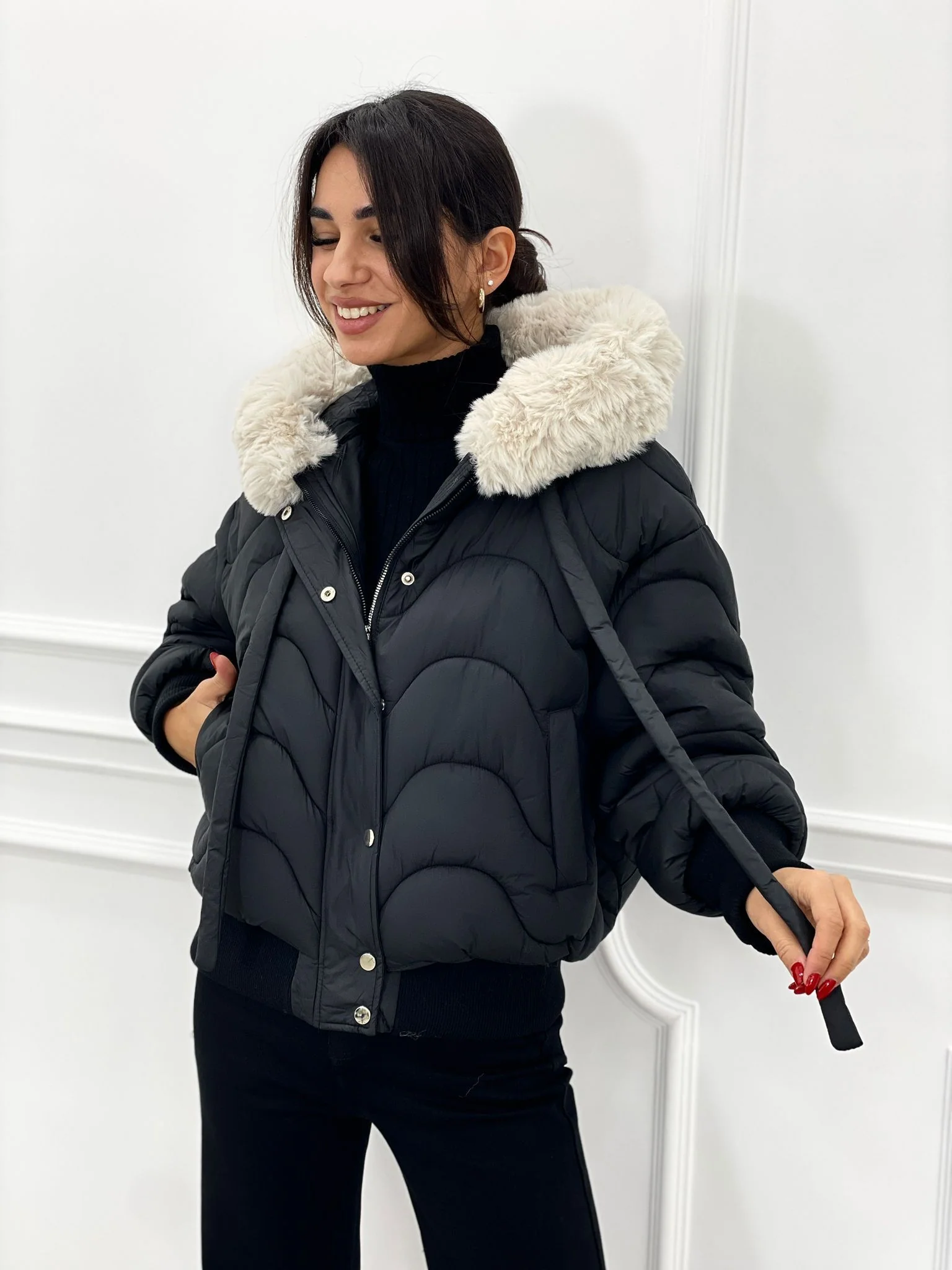 Piumino trapuntato con cappuccio in pelliccia(removibile)con tasche,chiusura zip e bottoni,interno foderato