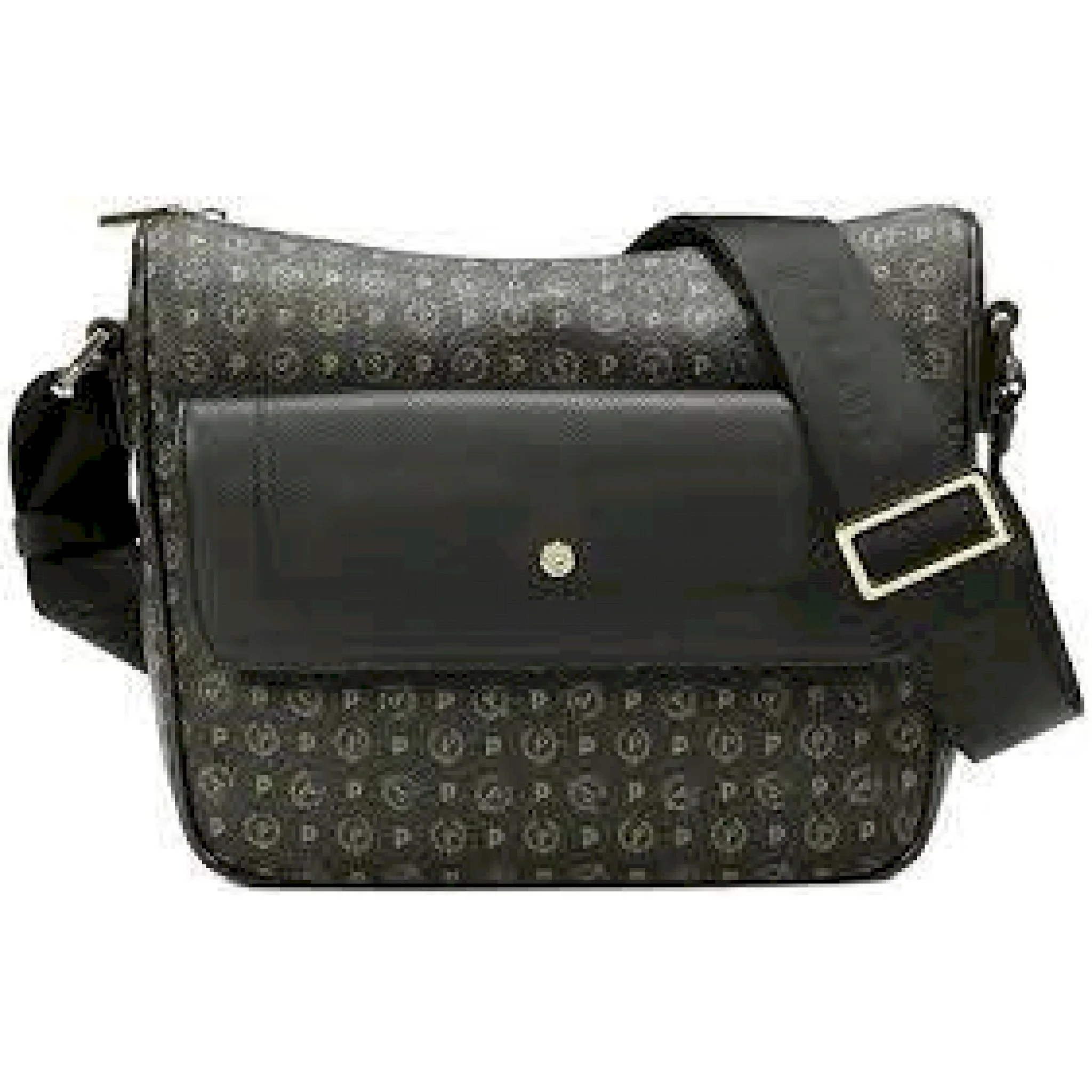 – tasca frontale con patta a contrasto in pelle