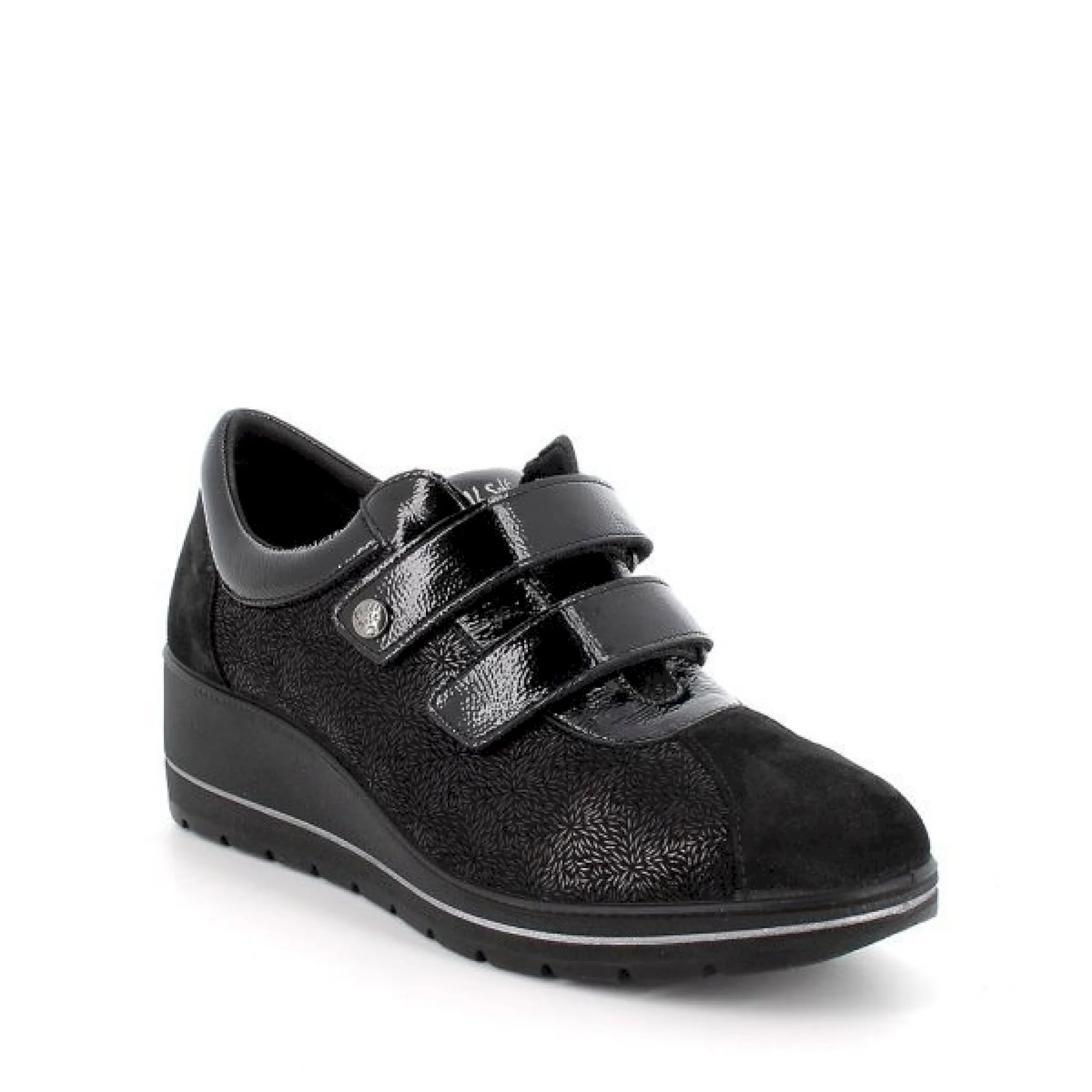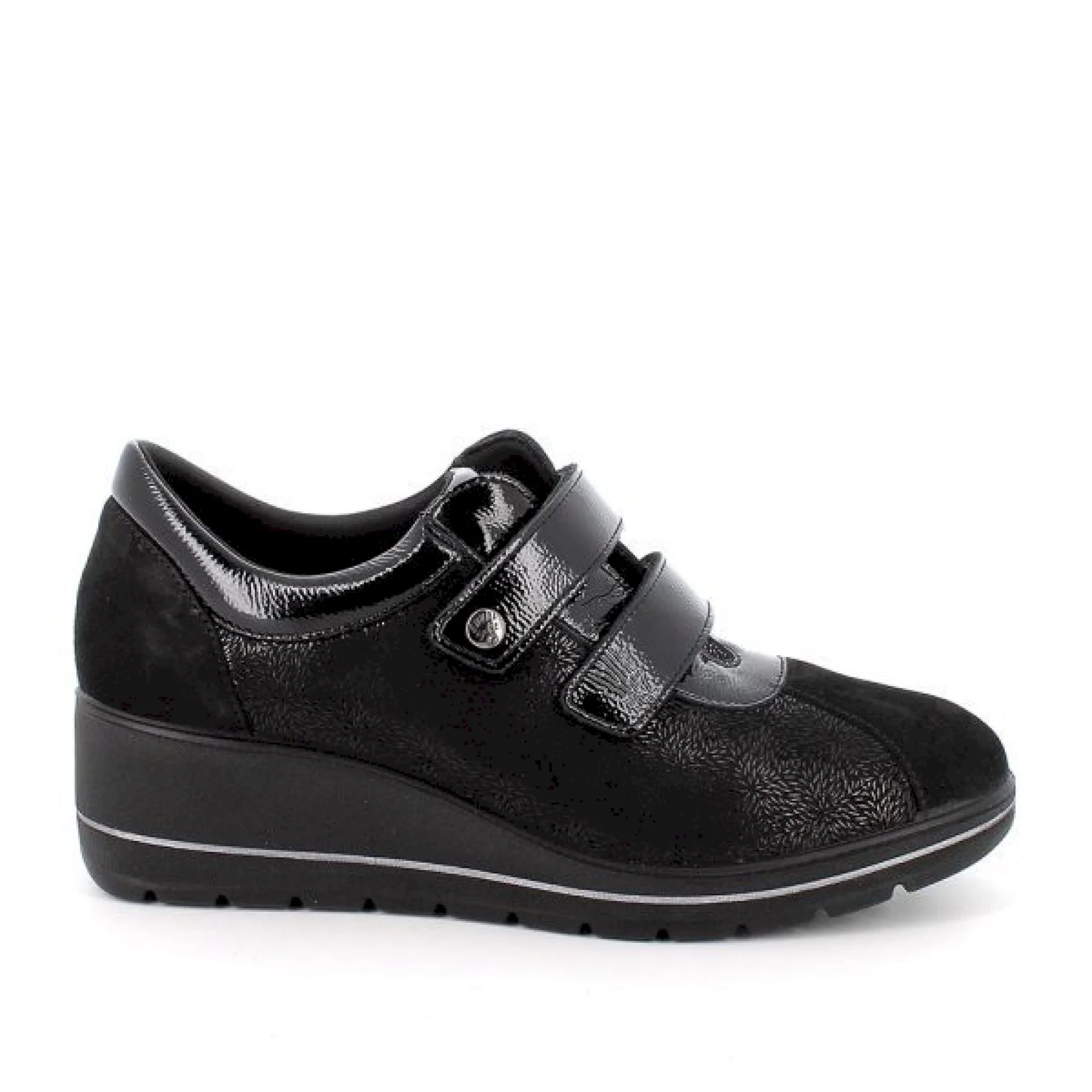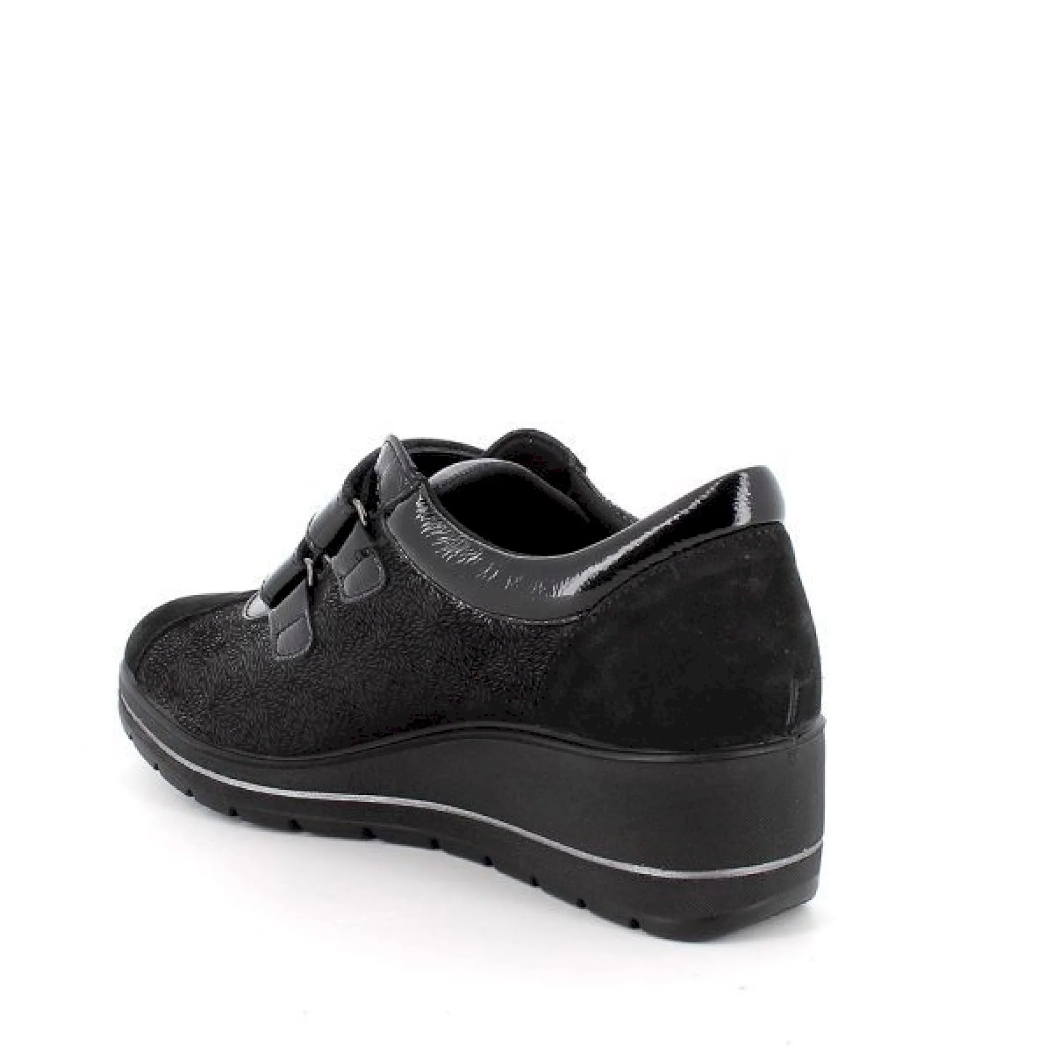Scarpa con chiusura doppio velcro da donna in pelle. la camminata ha tutto un altro stile con questo modello, comodo e pratico da indossare grazie alla chiusura con velcri. suola leggermente rialzata con inserto bicolore e gonfietto di protezione alla caviglia assicurano massimo comfort e ammortizzazione per la camminata. il sottopiede anatomico memory foam è estraibile e rivestito in pelle per assicurare traspirabilità e igiene.