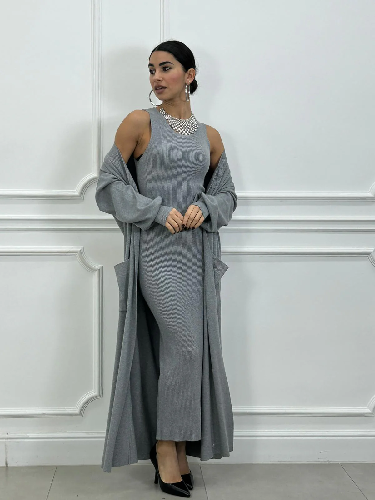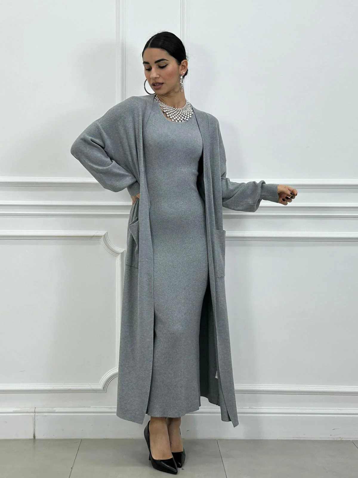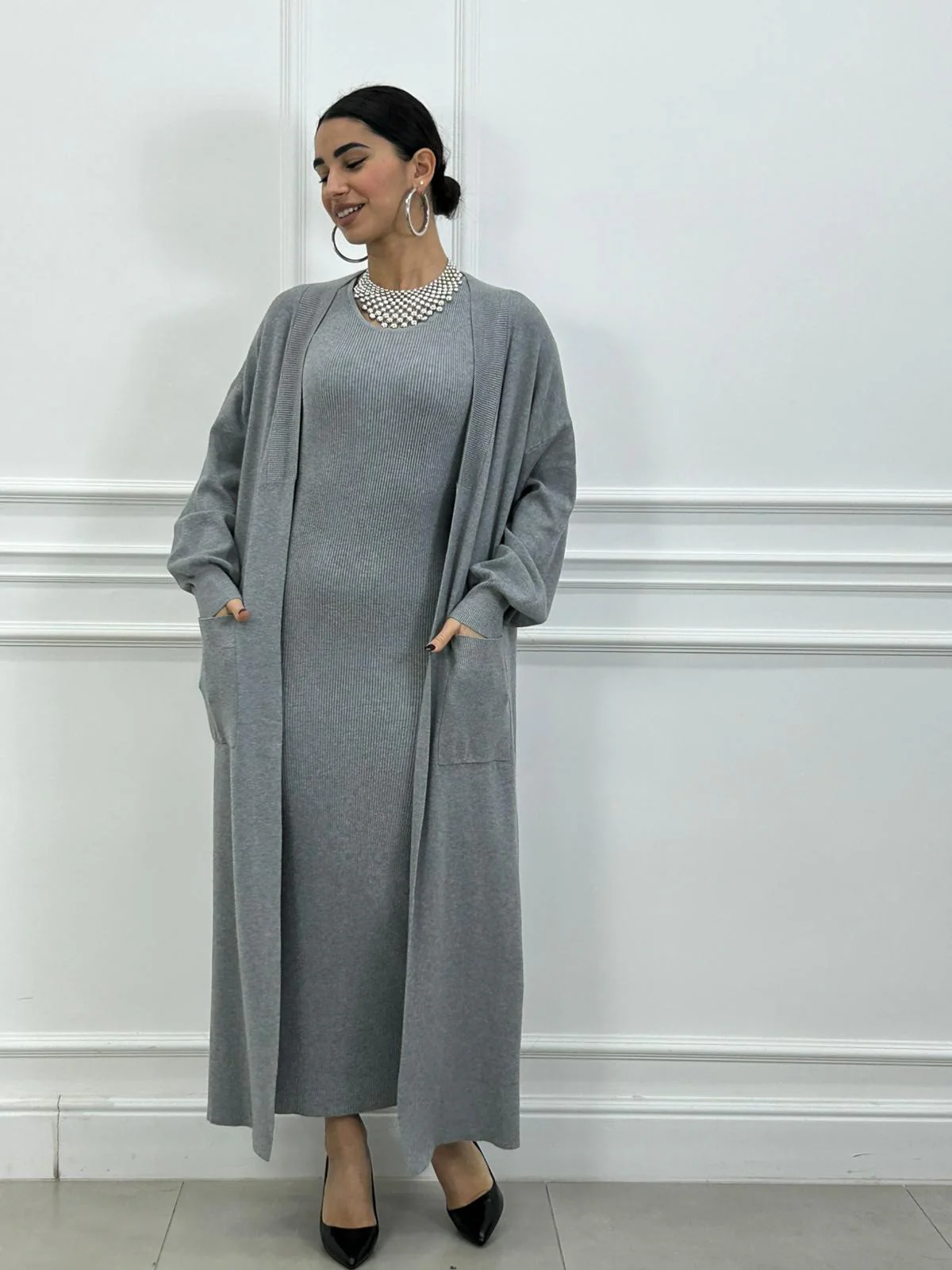Coordinato cardigan lungo con taschini e vestito smanicato
