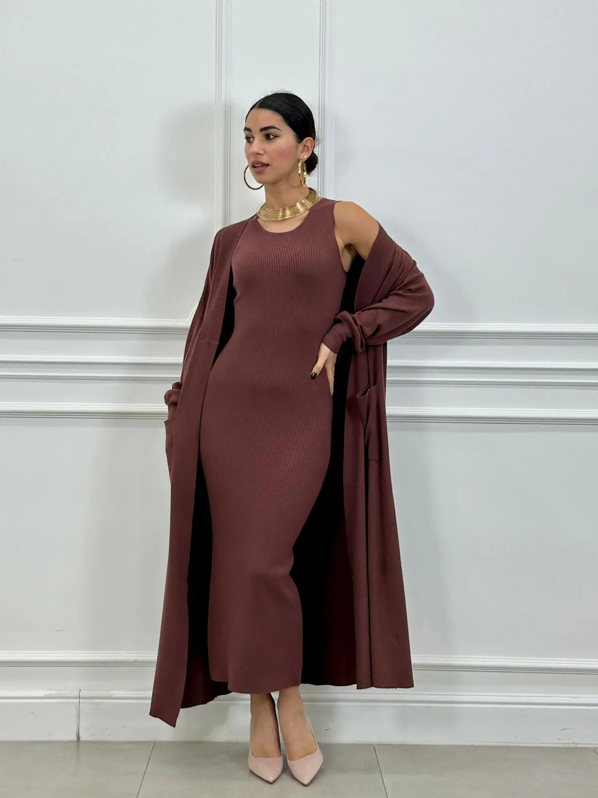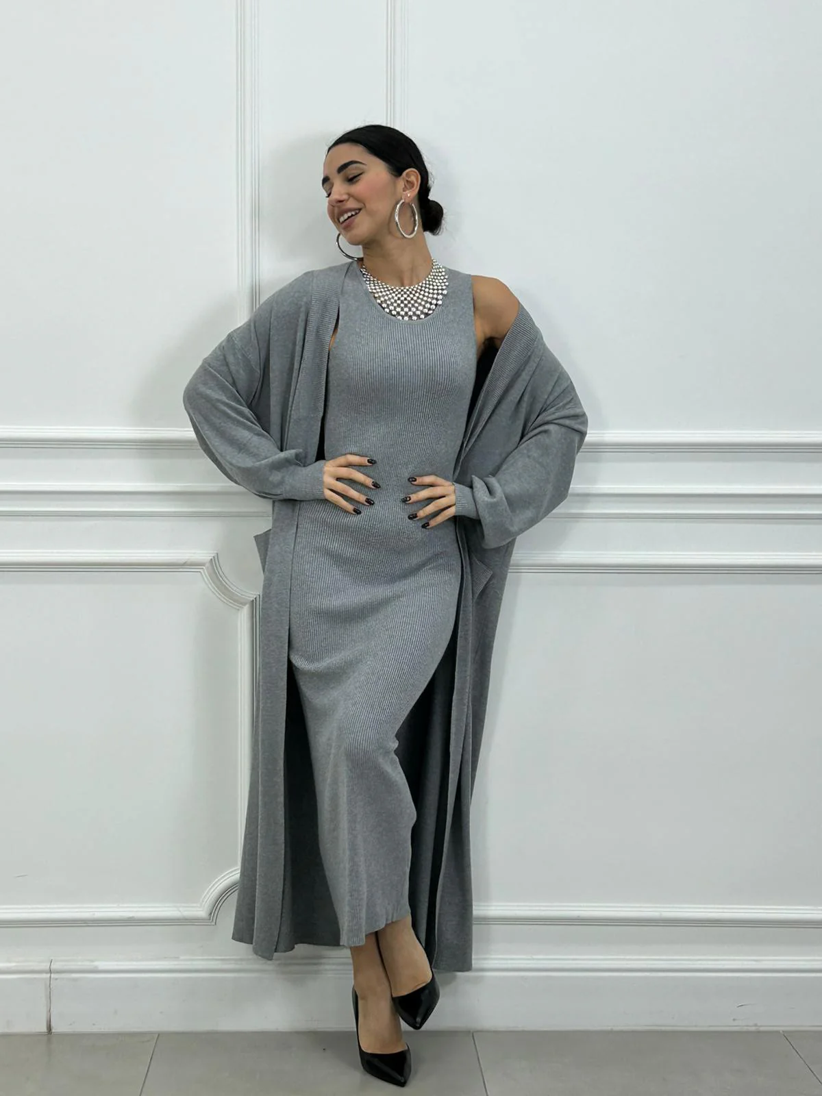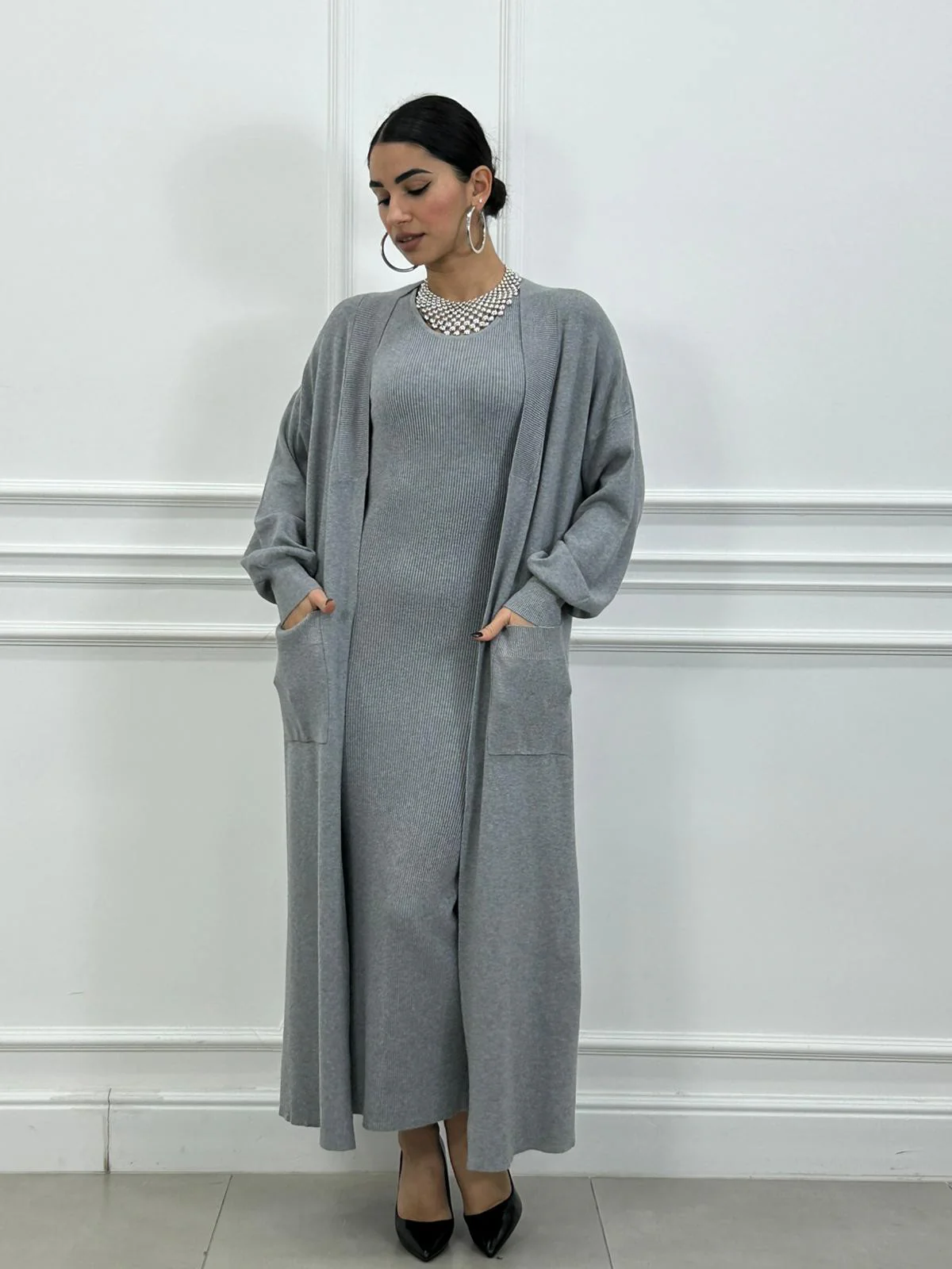 Coordinato cardigan lungo con taschini e vestito smanicato
