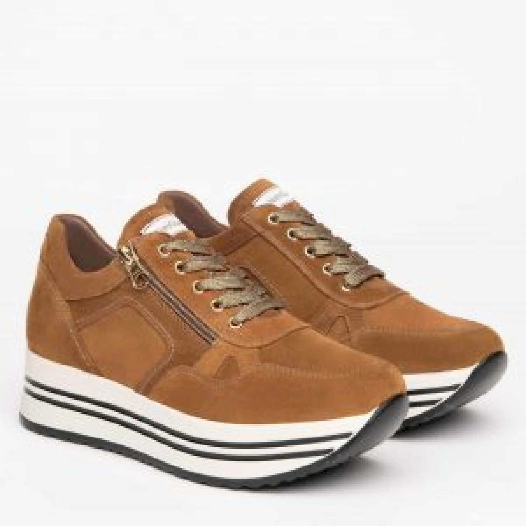 Sneakers in camoscio con lacci in lurex e fondo platform bicolore cm.4,5 . zip esterna x una calzata agevole e veloce.il sottopiede estraibile con tecnologia drygo assorbe l’umidita’ e garantisce confort e benessere.