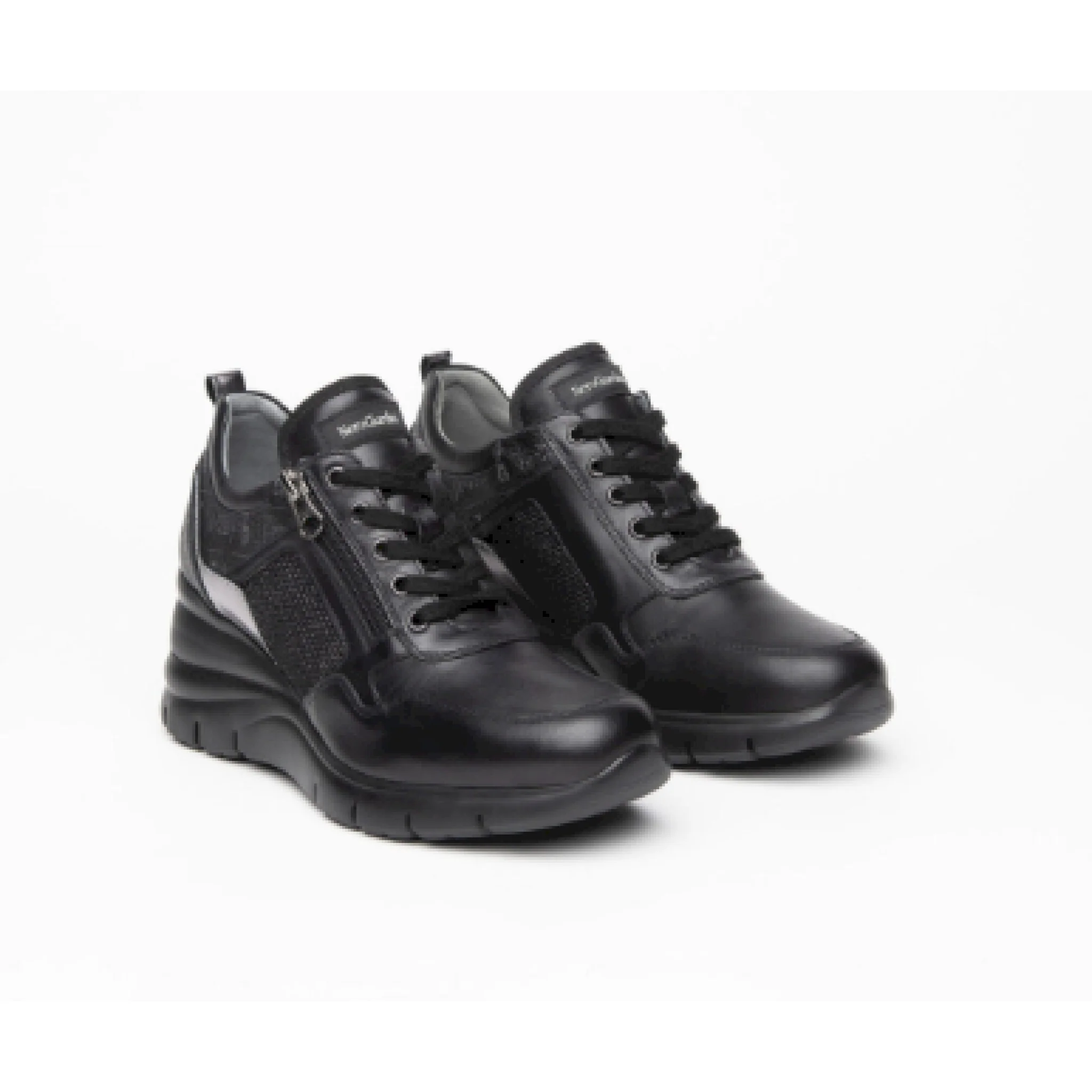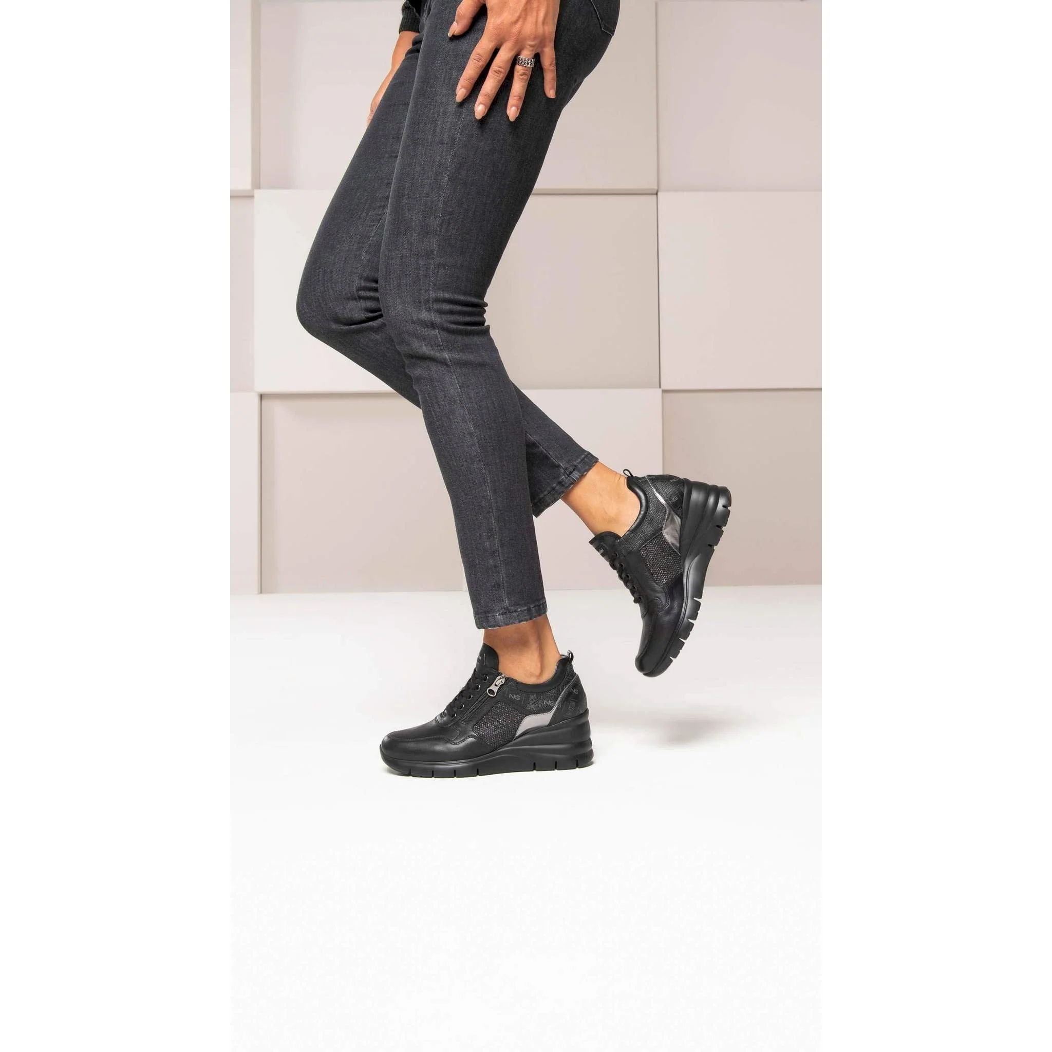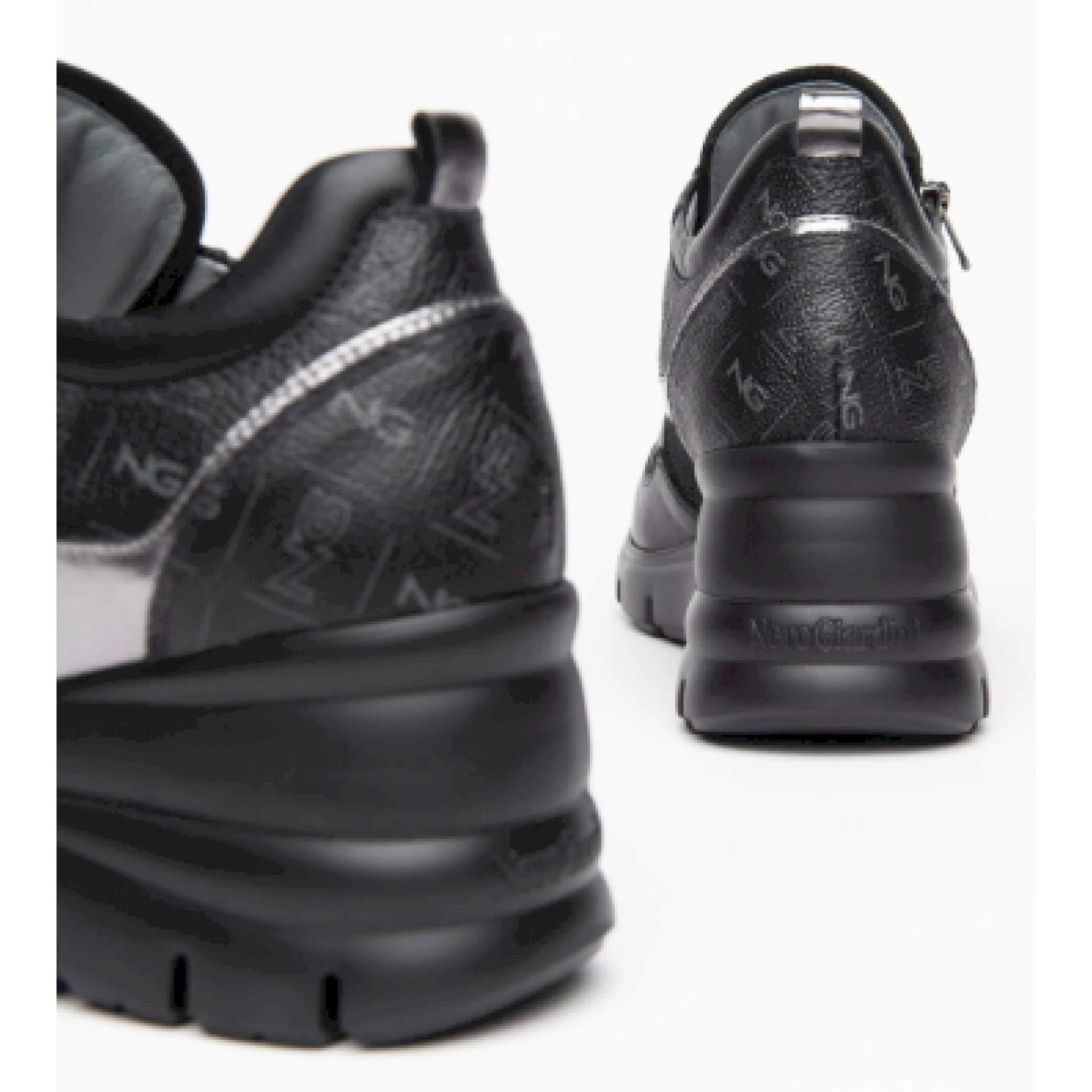 Sneaker in morbida pelle con inserti in pelle laminata , tessuto tecnico e pelle con stampa logo.fondo in eva di 6 cm. e zip esterna per una calzata facile e veloce .il sottopiede estraibile con tecnologia drygo assorbe l’umidita’ e garantisce confort e benessere.
