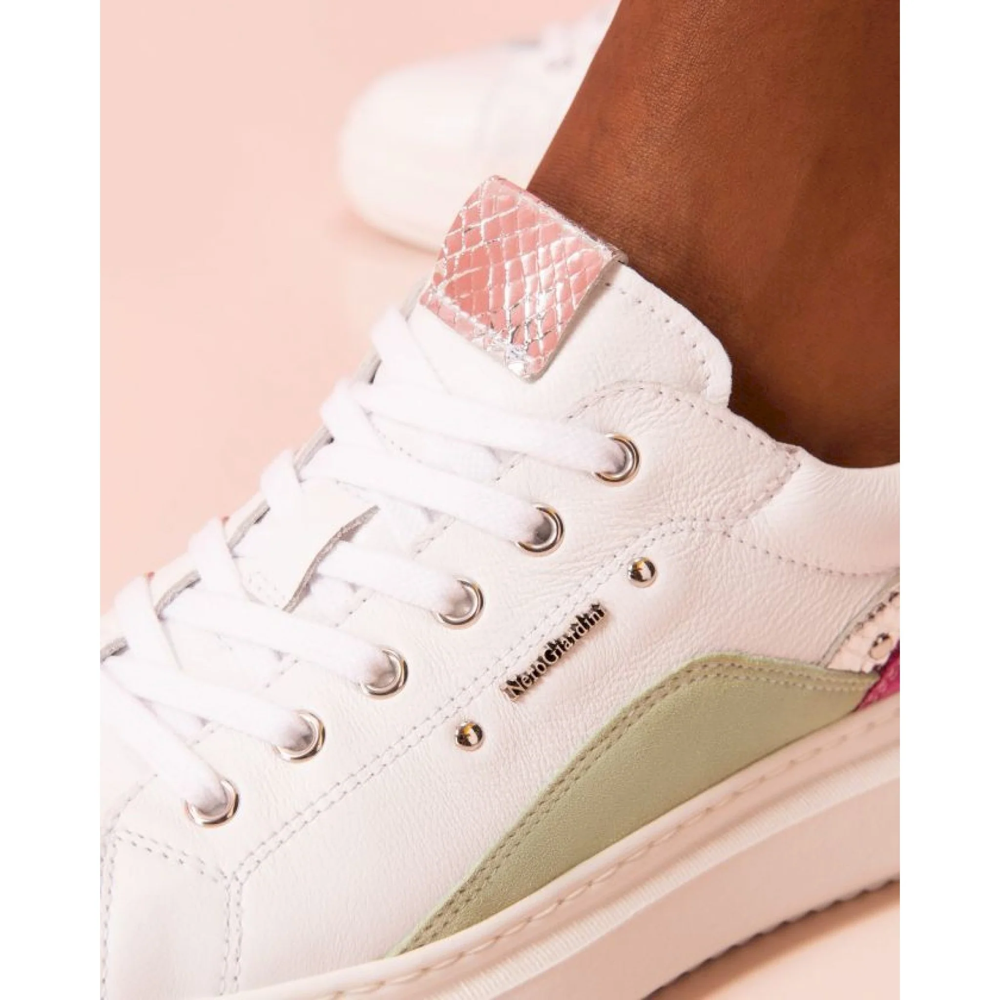 Sneakers nerogiardini realizzate in italia con materiali di qualità e testati in laboratorio. la continua ricerca stilistica garantisce calzature dai trend sempre originali ed estremamente comode da indossare. design ricercato per un look dallo stile inconfondibile. il sottopiede con tecnologia drygo!® assorbe l’umidità e garantisce confort e benessere. la produzione made in italy delle calzature nerogiardini è sottolineata dal tricolore impresso sulle suole e sul packaging.