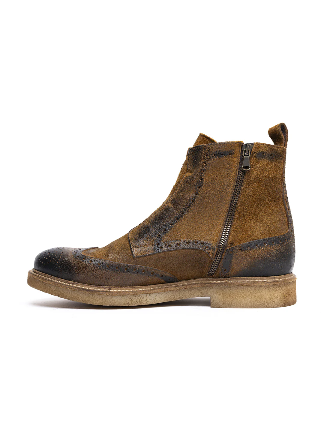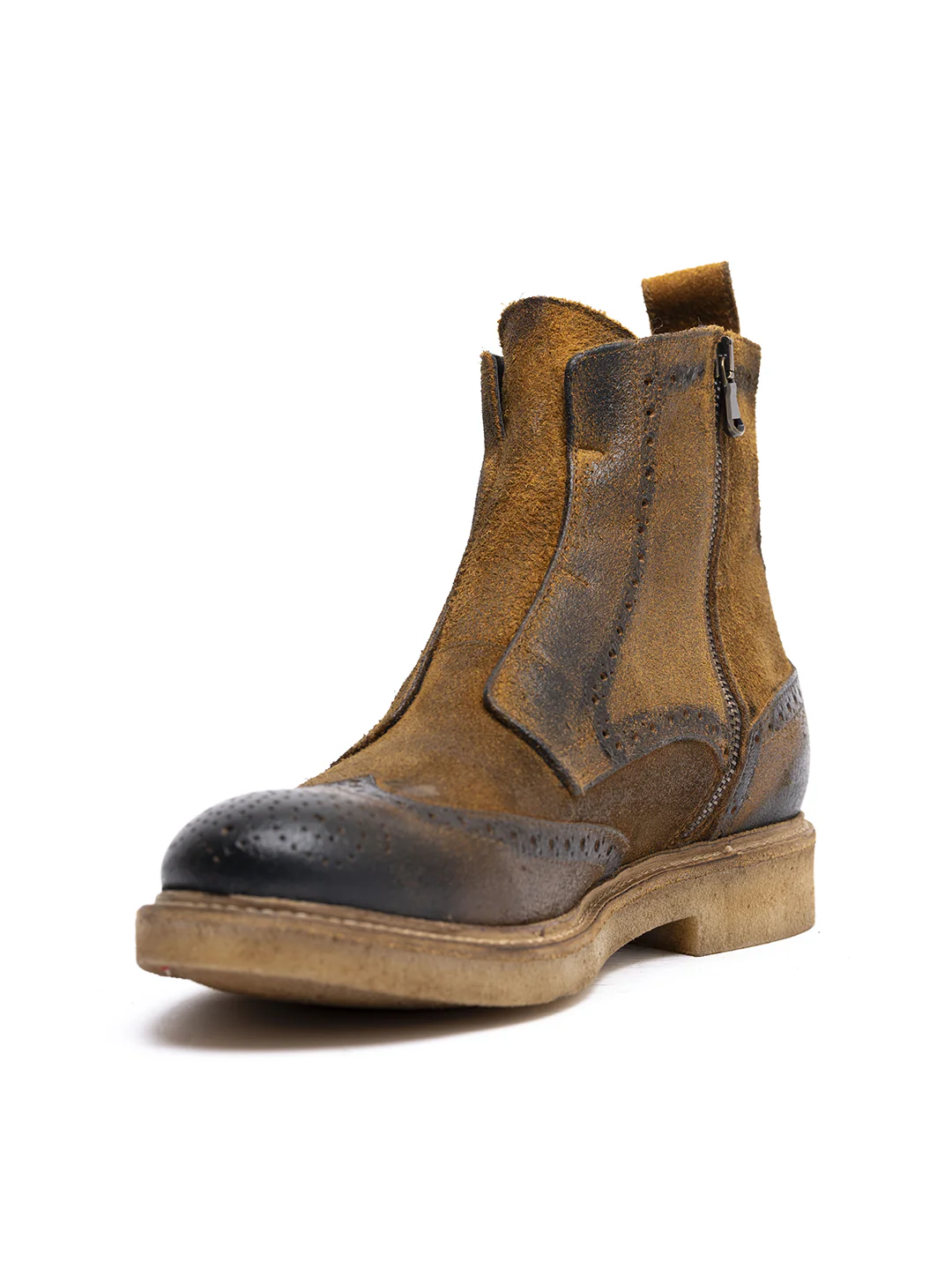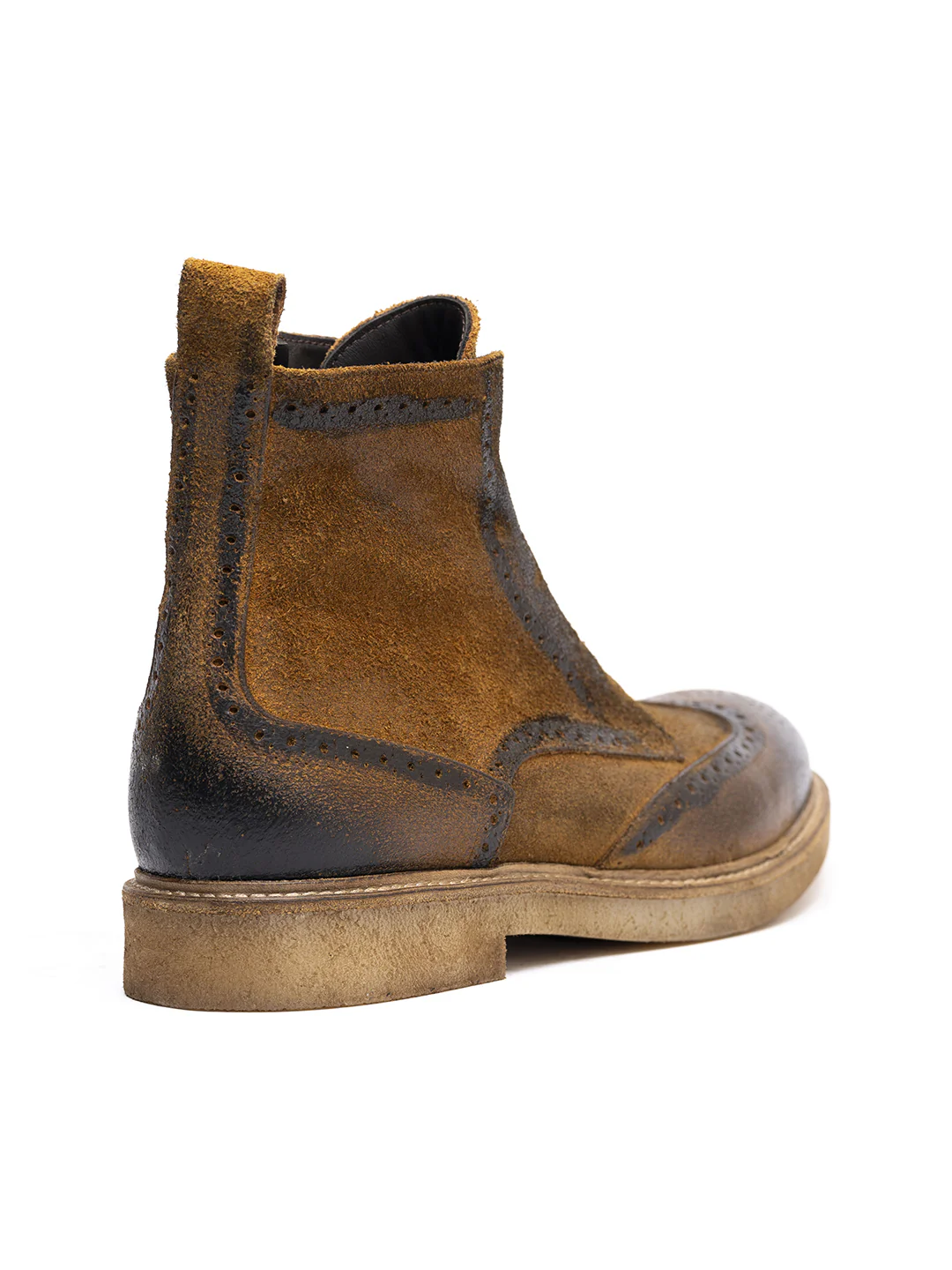 Tipo di lavorazione: pellame ingrassato e spazzolato a mano con sfumature testa di moro. La suola è fissata alla tomaia tramite la cucitura «Blake»