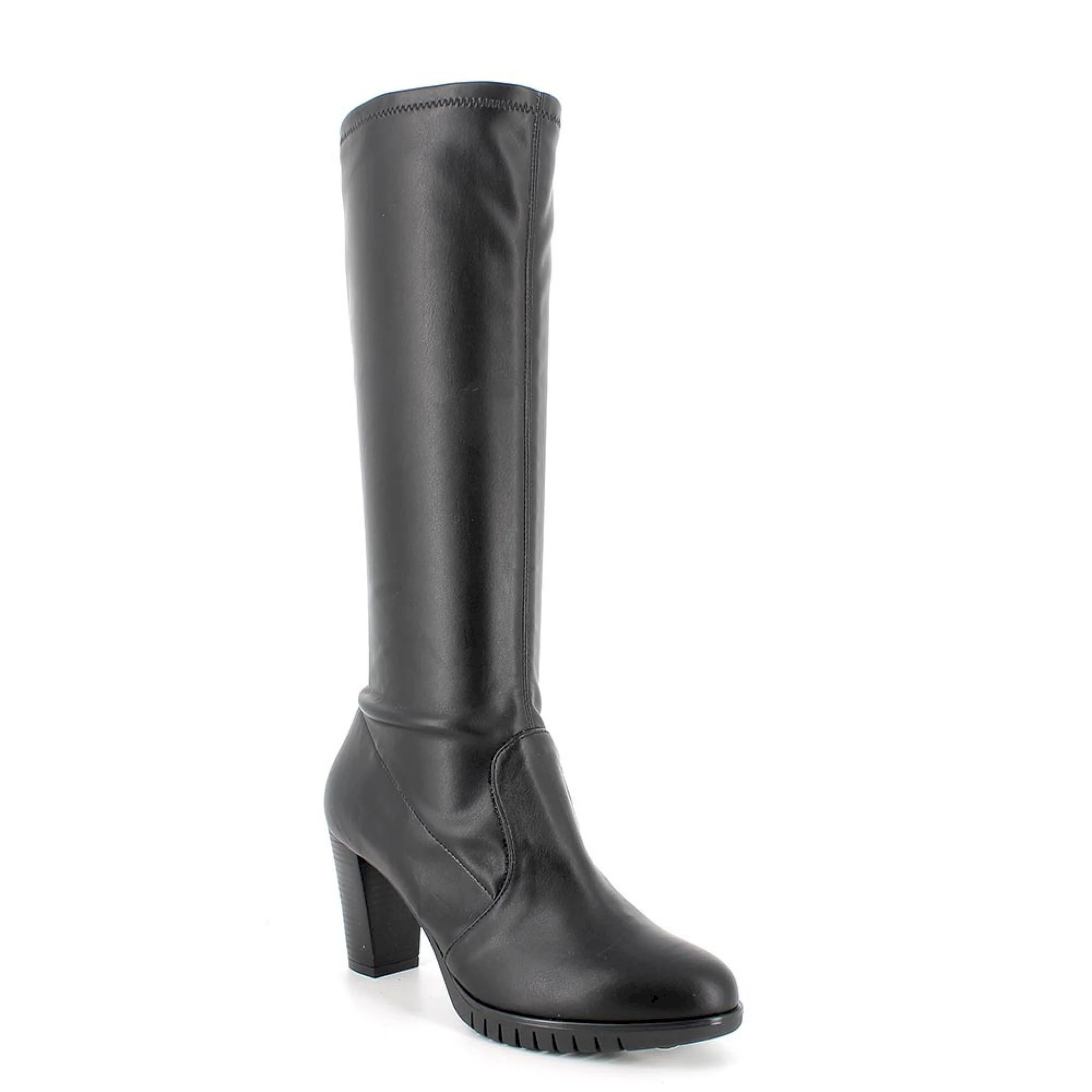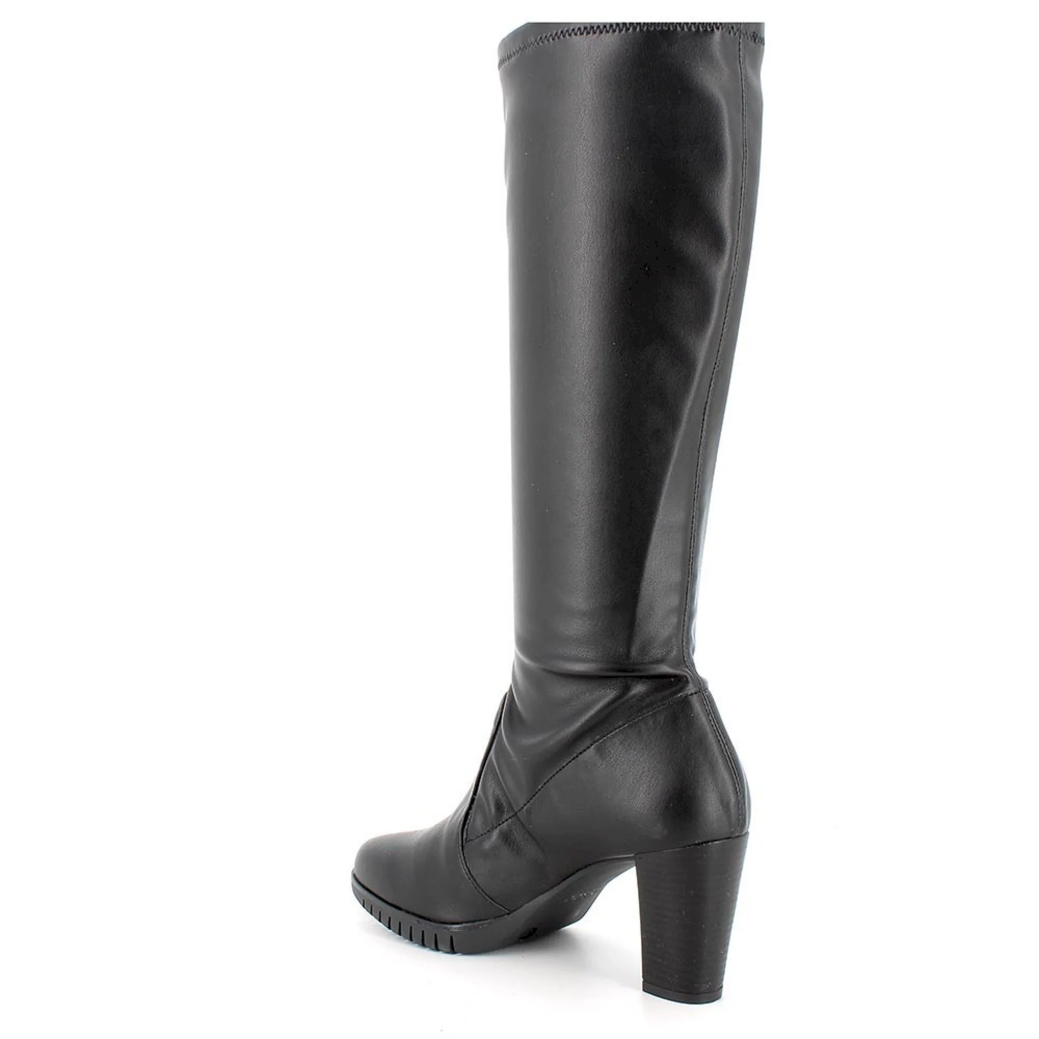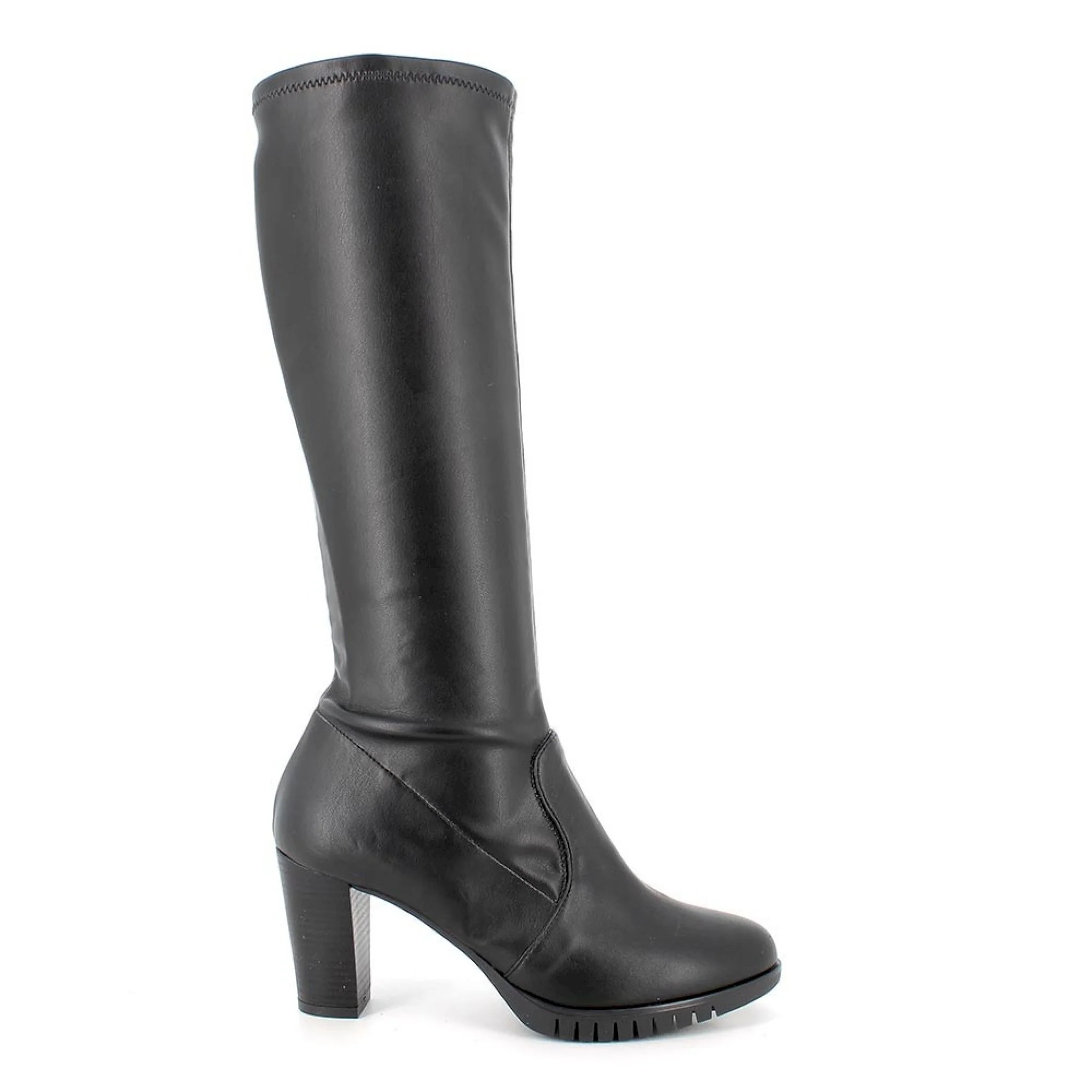 Stivale alto con tacco dal look deciso. sono realizzati in pelle sintetica elasticizzata, un giusto equilibrio per un look aggressivo e comodo. il sottopiede in pelle, garantisce una massima igiene.