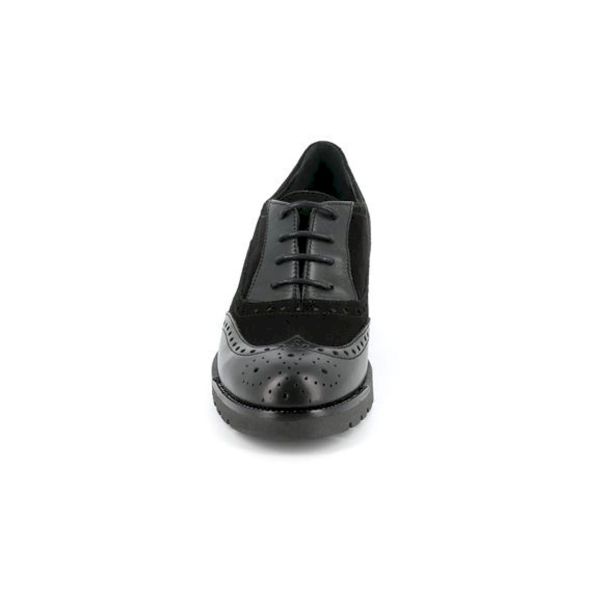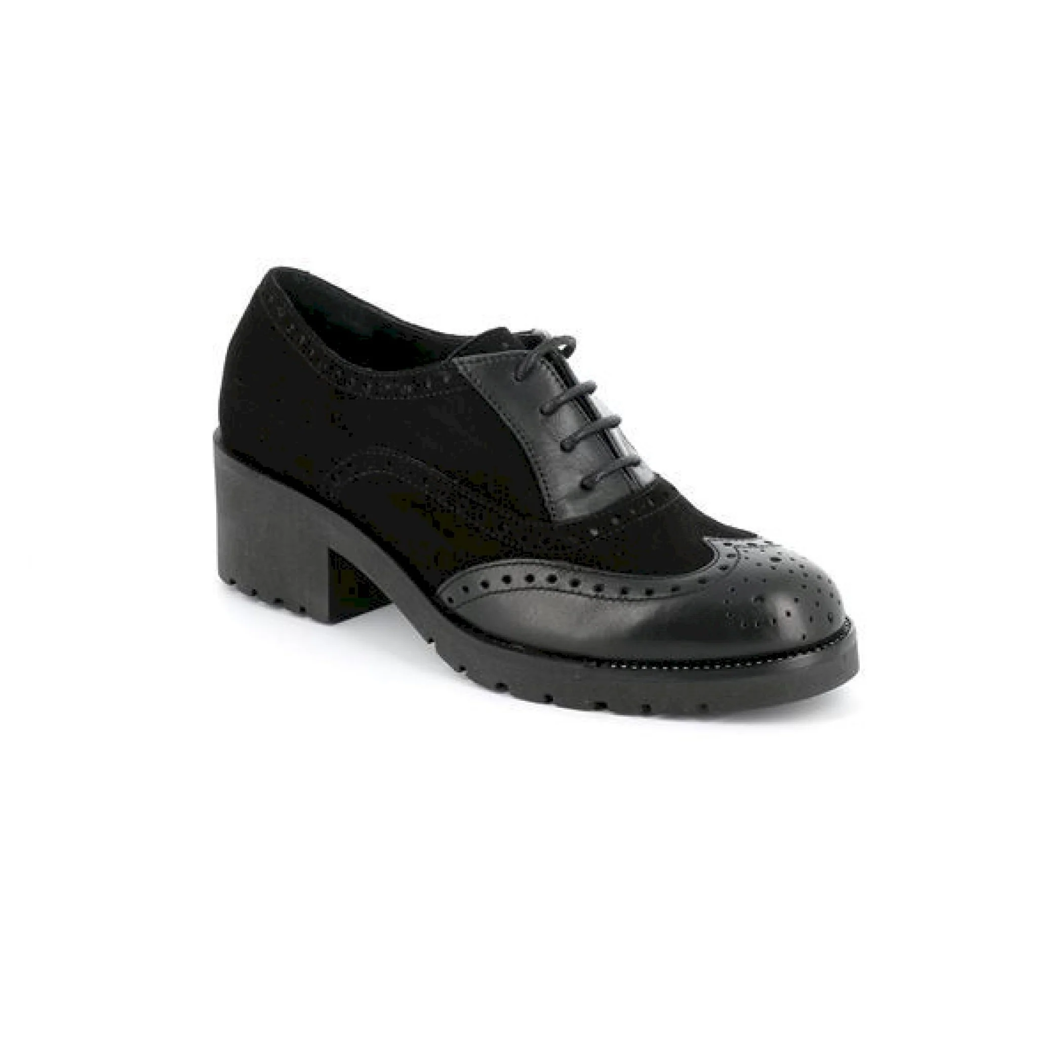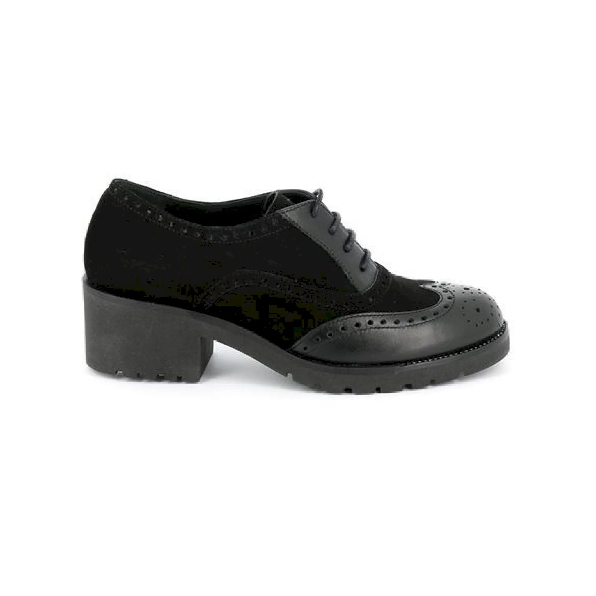 Camoscio in tinta unita e rinforzi in pelle laminata in ton sur ton compongono la tomaia di questa derby in stile inglese. il tacco, confortevole e facile da portare slancia e sottolinea la bellezza della figura femminile. una scarpa che ben si adatta all’ufficio e al tempo libero.