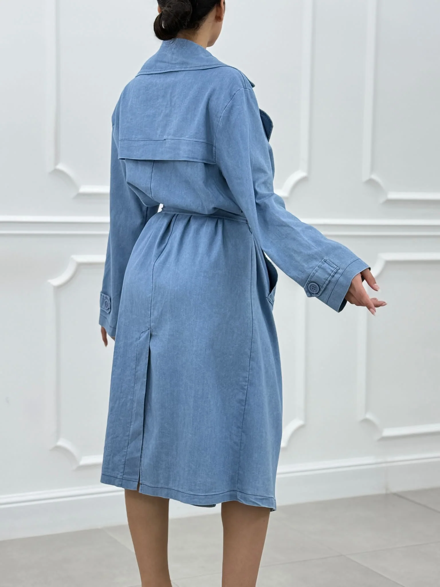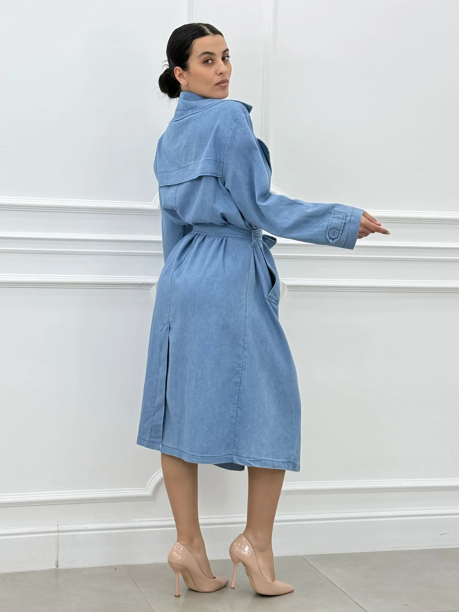 Trench denim con tasche,bottoni e cintura