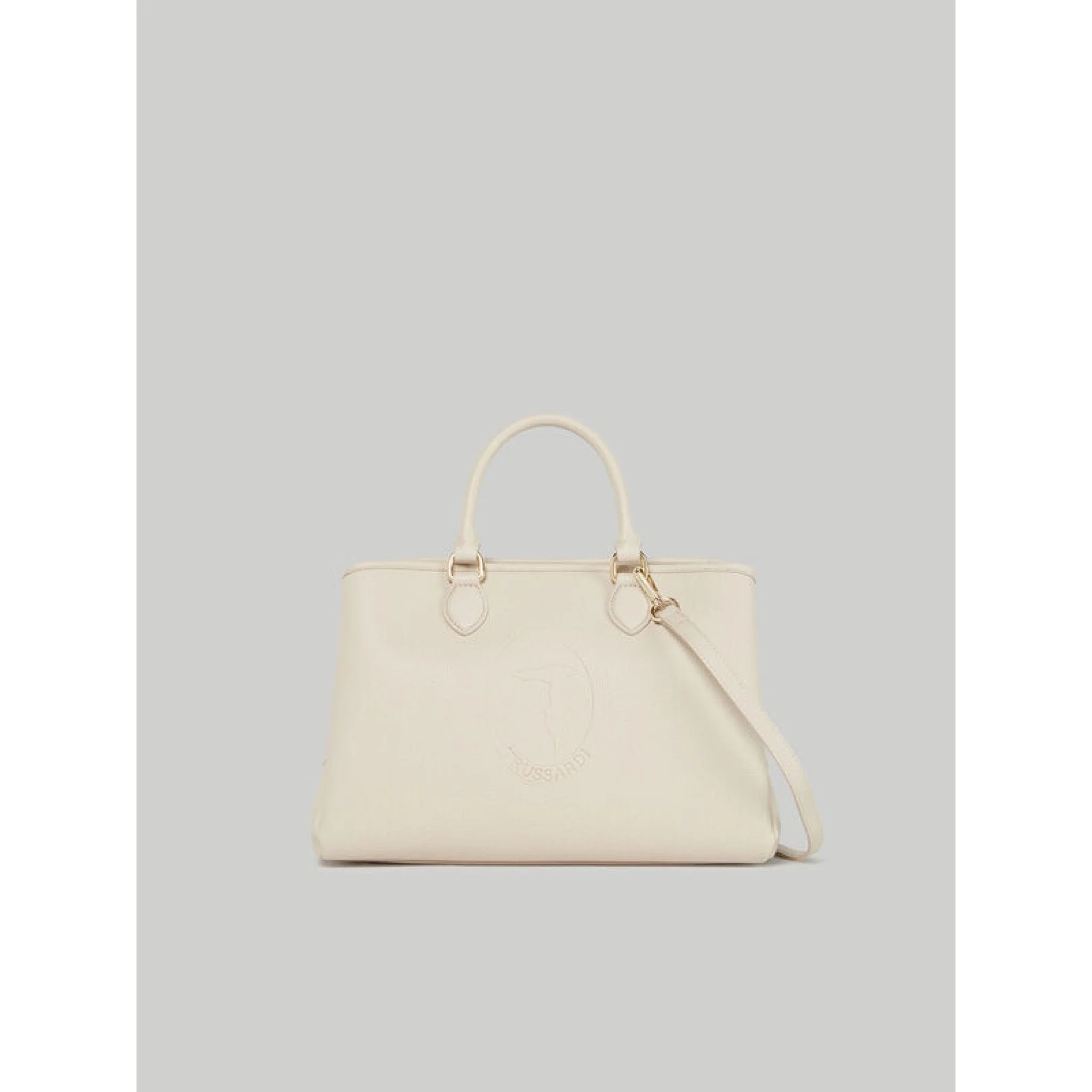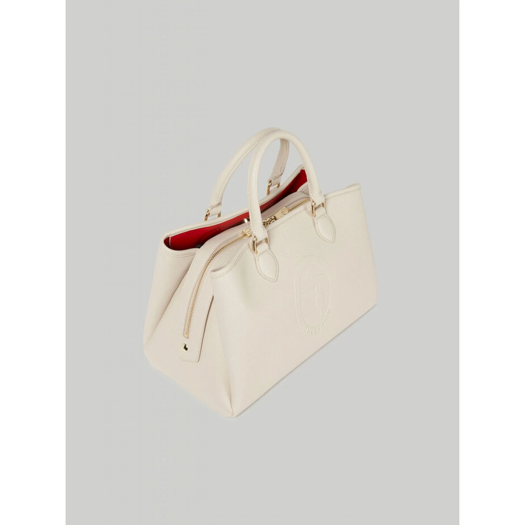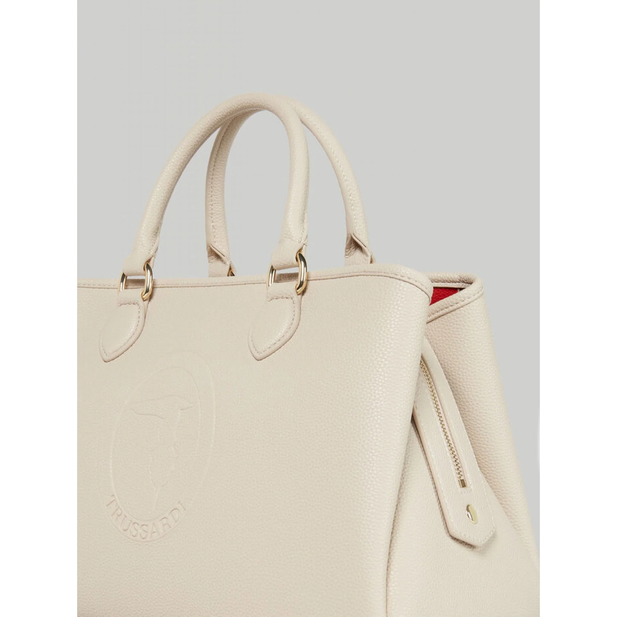 Tote bag iris realizzata in similpelle tinta unita, dalla caratteristica texture a stampa cervo, con ampio scomparto interno e chiusura zip. moderna e di tendenza, è personalizzata con il logo monogram trussardi stampato leggermente a rilievo. la lunga tracolla rimovibile permette di indossarla cross-body o portarla a spalla con doppio manico.