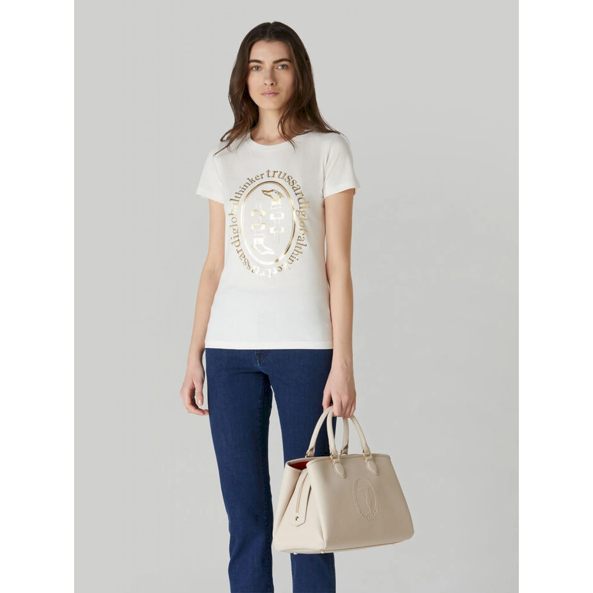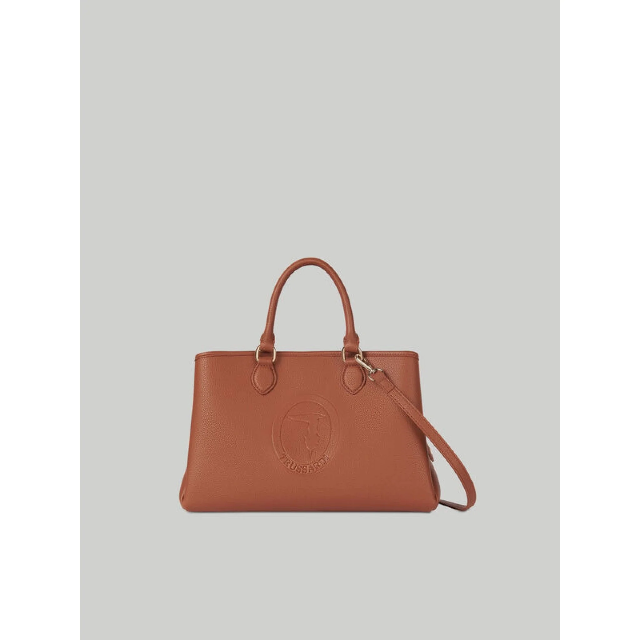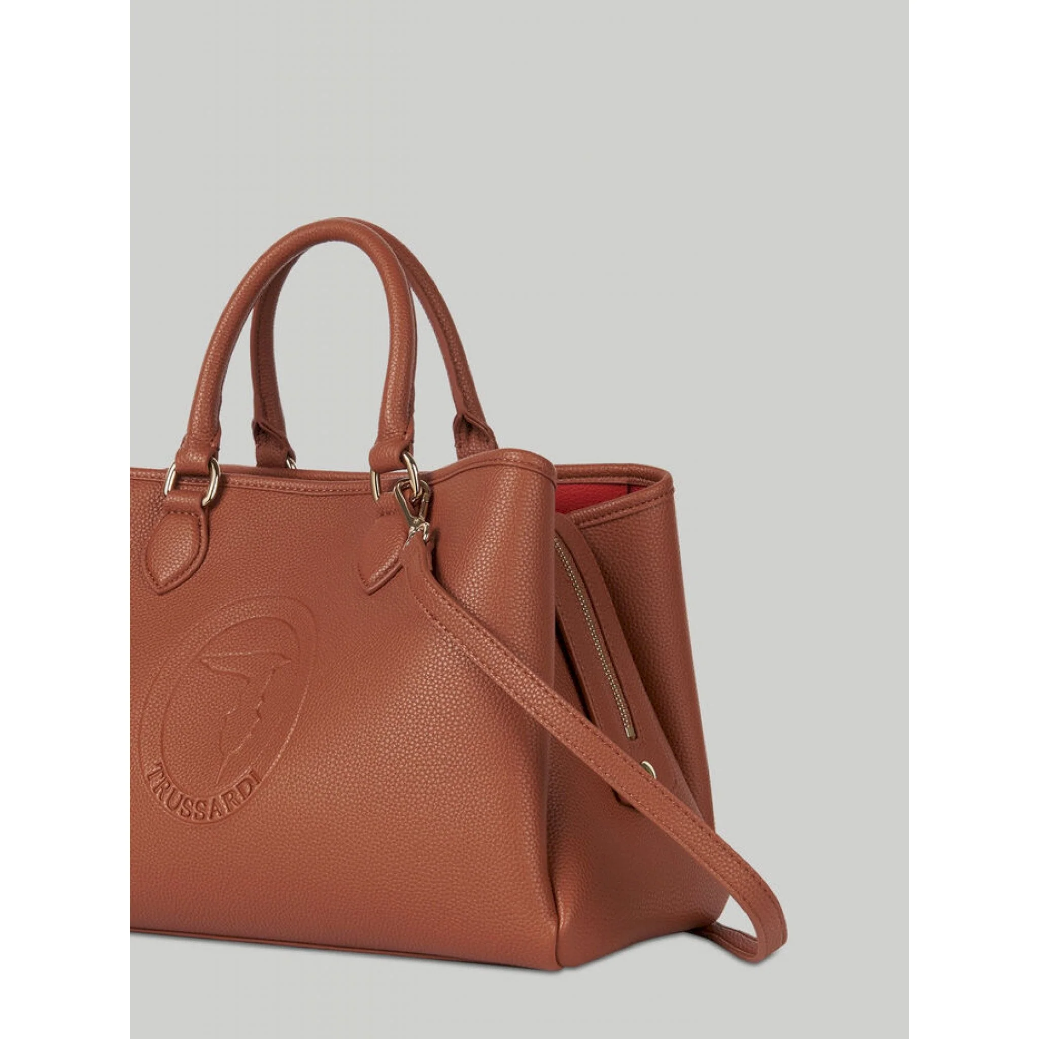 Tote bag iris realizzata in similpelle tinta unita, dalla caratteristica texture a stampa cervo, con ampio scomparto interno e chiusura zip. moderna e di tendenza, è personalizzata con il logo monogram trussardi stampato leggermente a rilievo. la lunga tracolla rimovibile permette di indossarla cross-body o portarla a spalla con doppio manico.