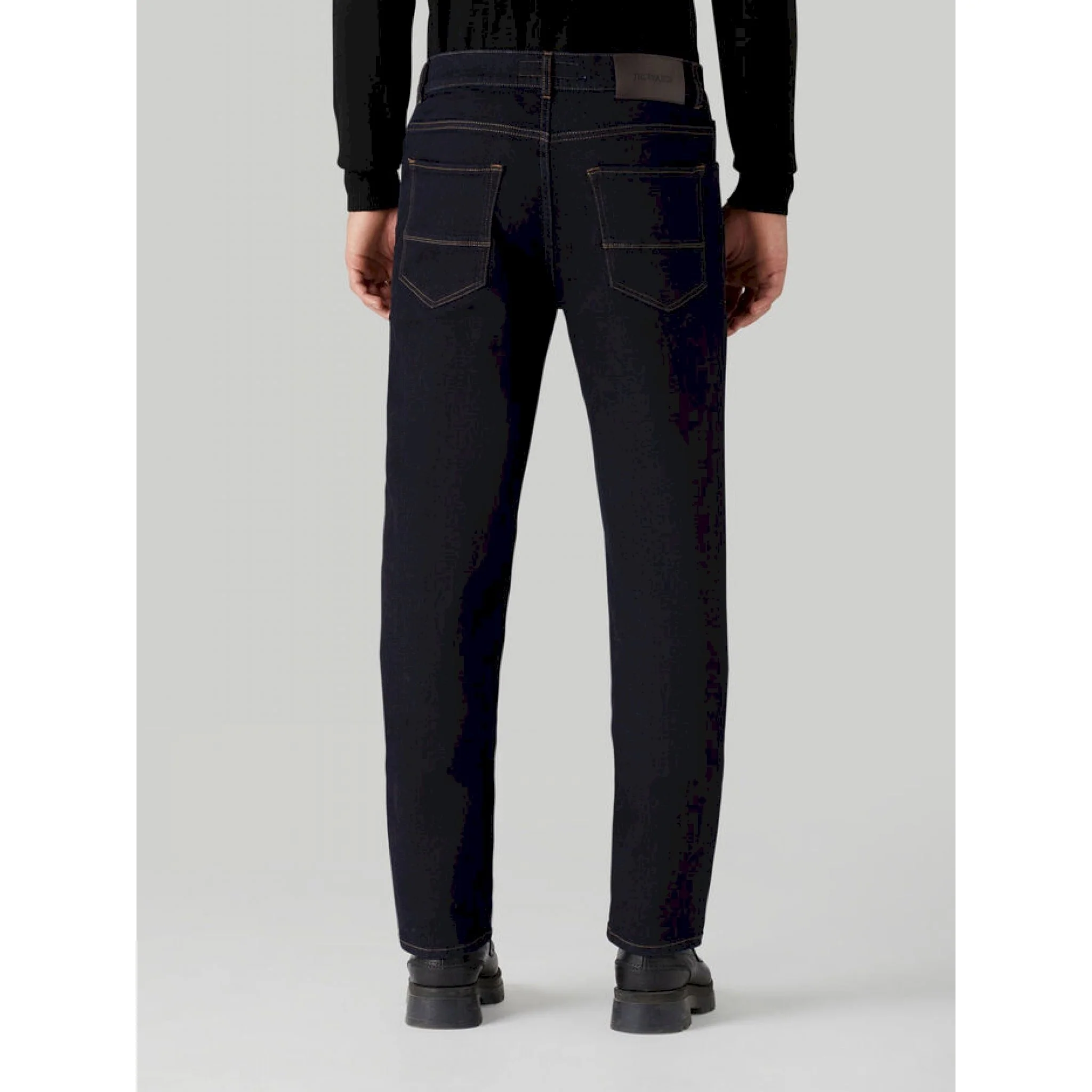 Jeans 5 tasche 380 icon realizzato in denim di cotone leggermente elastico. le cuciture a contrasto color tabacco evidenziano la linea dritta e i dettagli tradizionali. il modello è rifinito con dettaglio monogram ricamato a contrasto sul taschino orologio, rivetti in metallo e salpa logata sul retro. chiusura con zip coperta e bottone a chiodo.