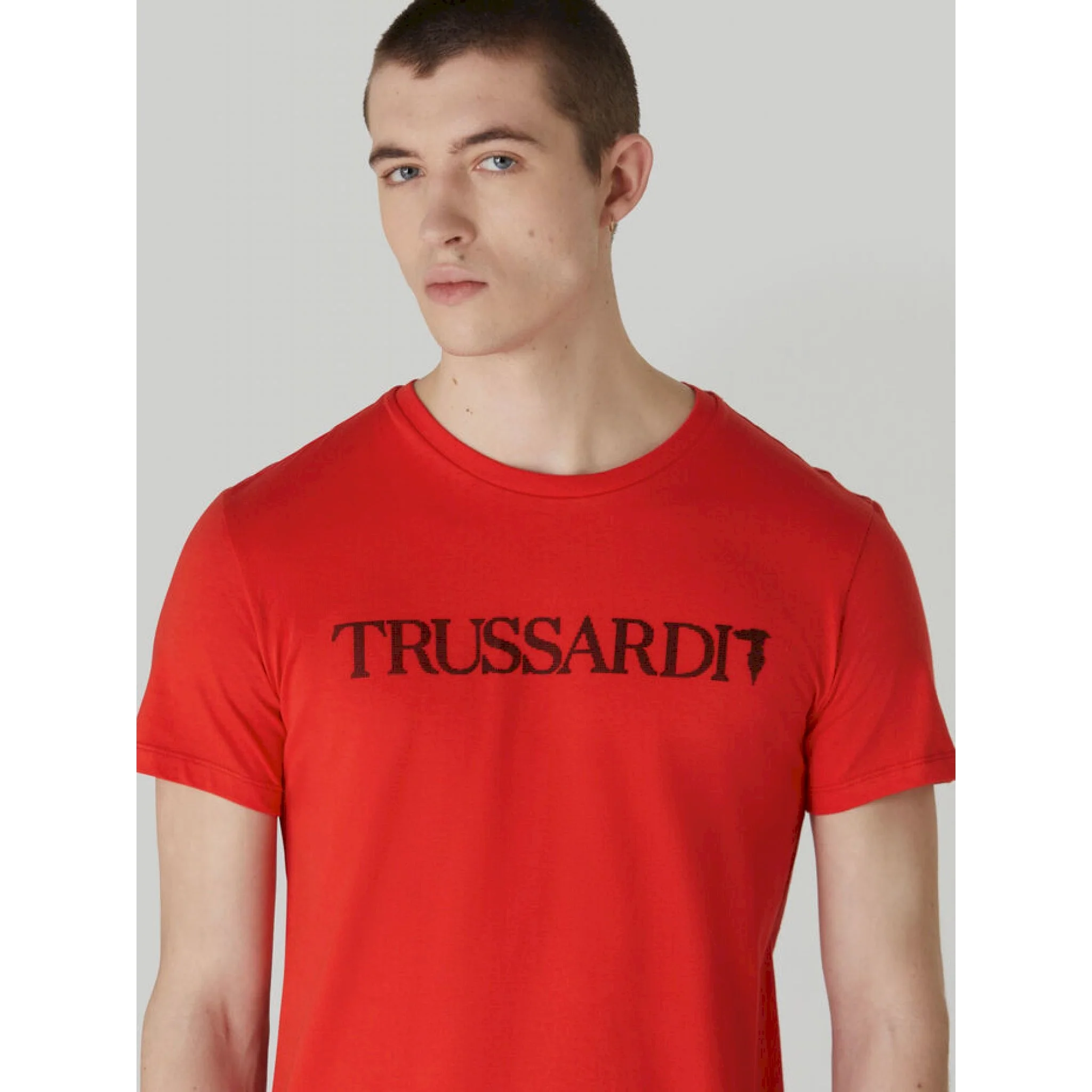 T-shirt a maniche corte realizzata in jersey di puro cotone tinta unita. lo stile basic del modello è arricchito dalla maxi stampa sul davanti, che riproduce il lettering trussardi in tonalità a contrasto. un capo che si presta a molteplici occasioni d’uso, con le felpe o con i giubbotti della nuova collezione uomo.