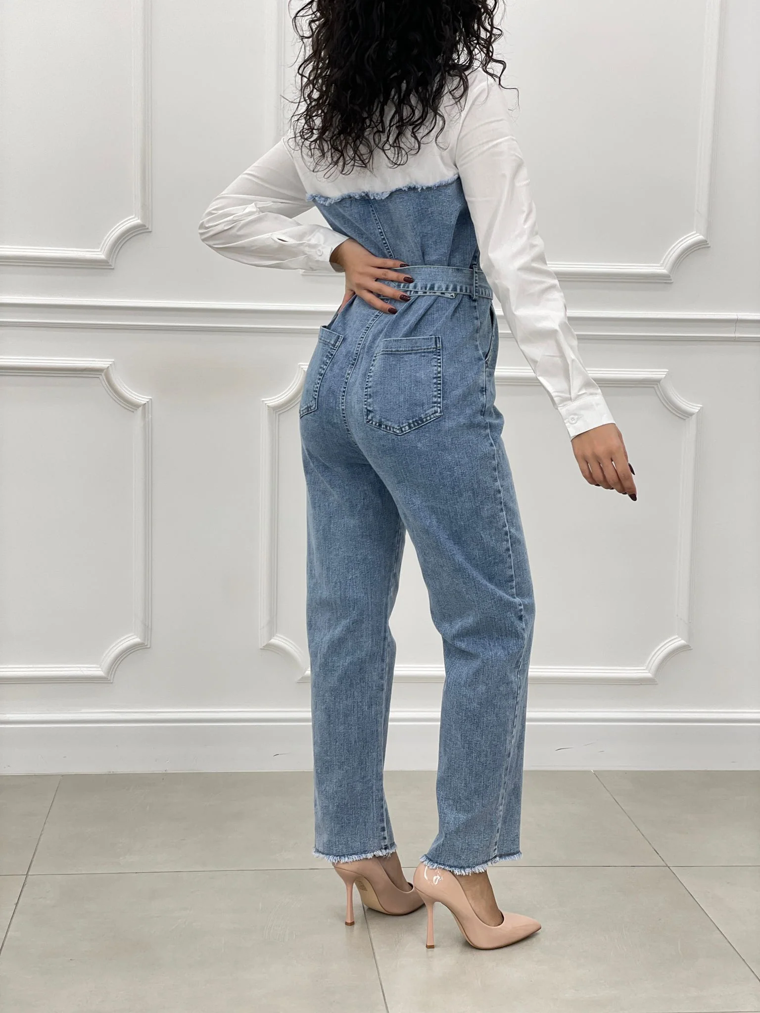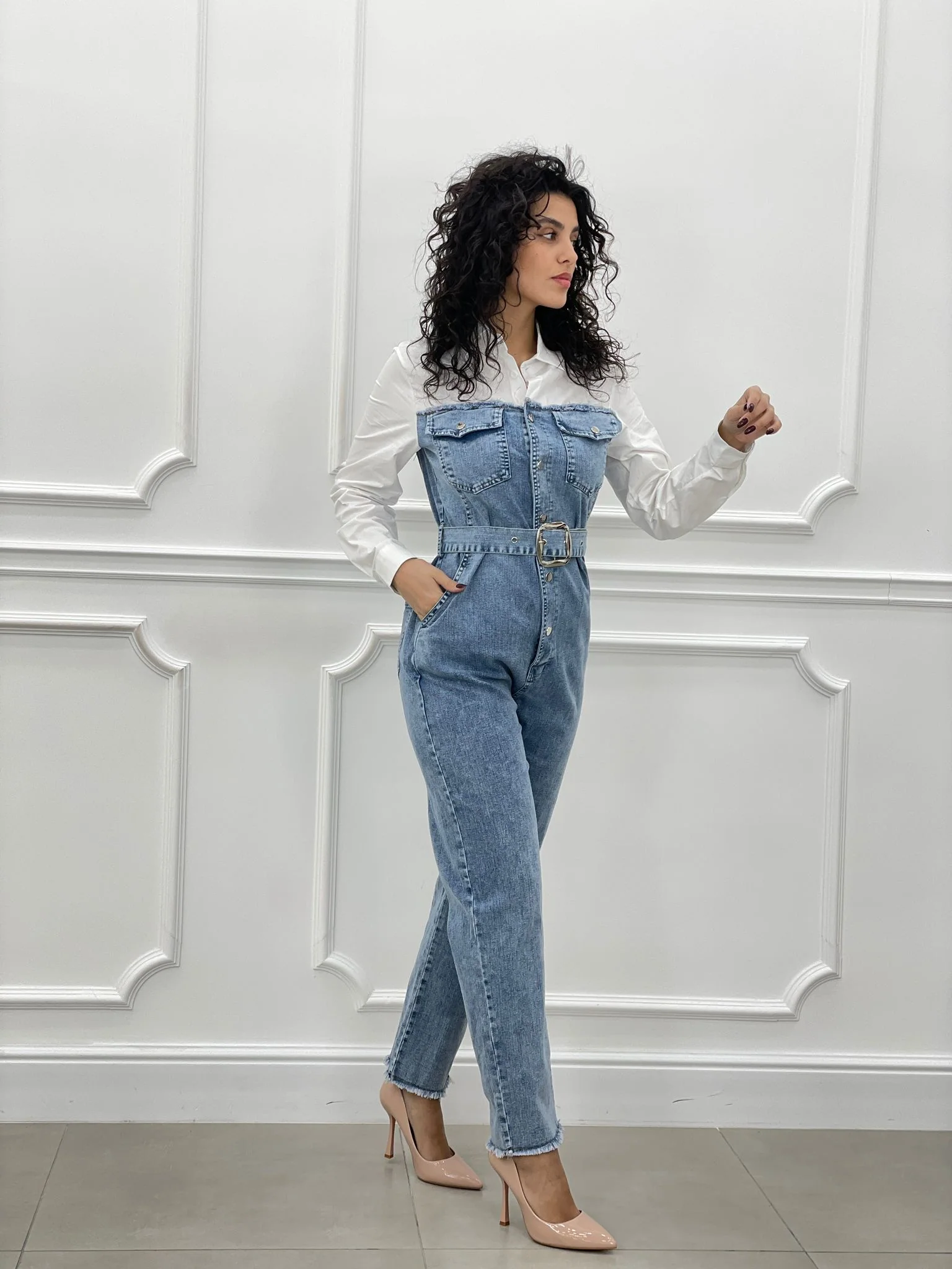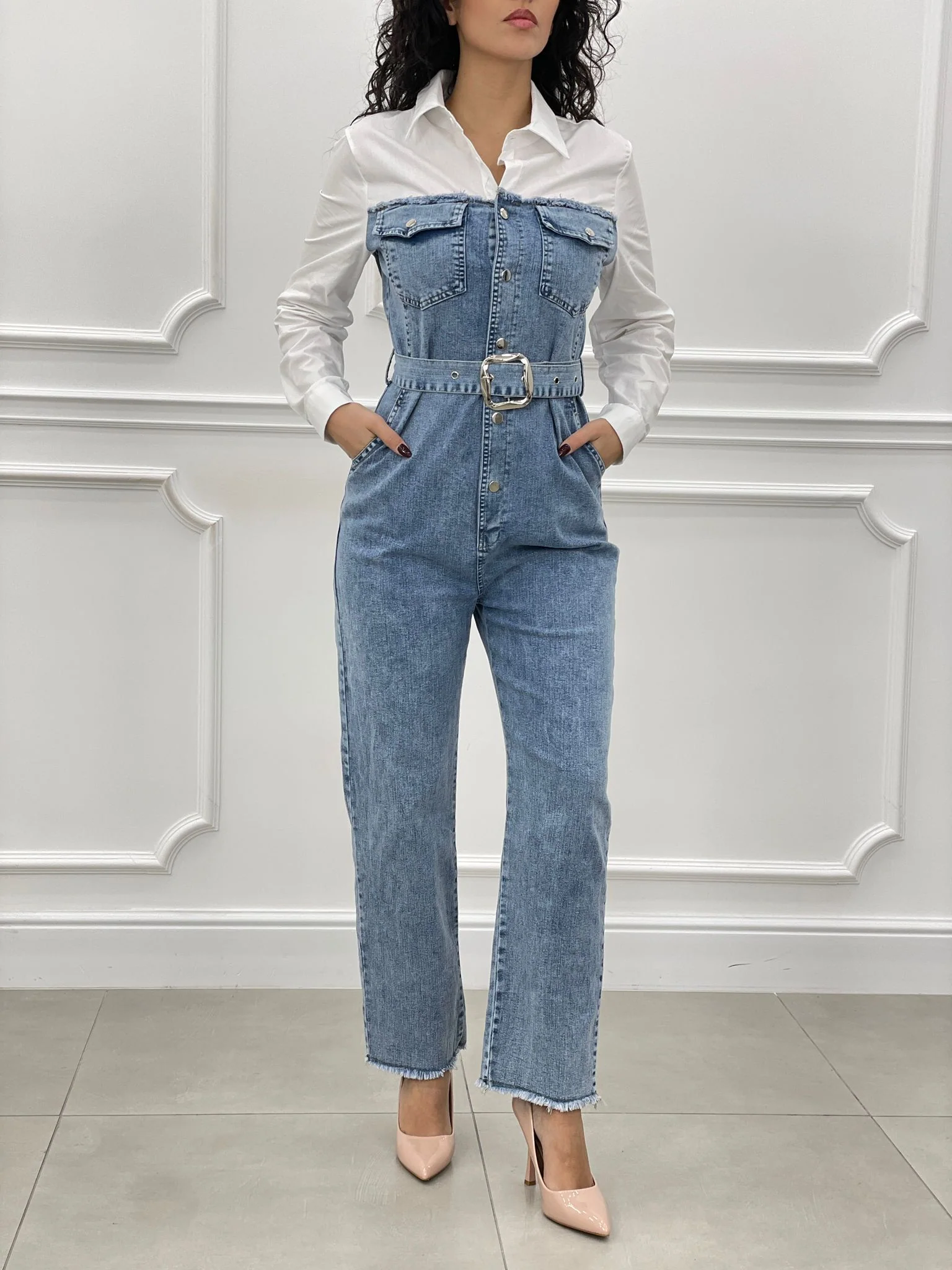 Tuta denim con camicia,cintura bottoni e tasche
