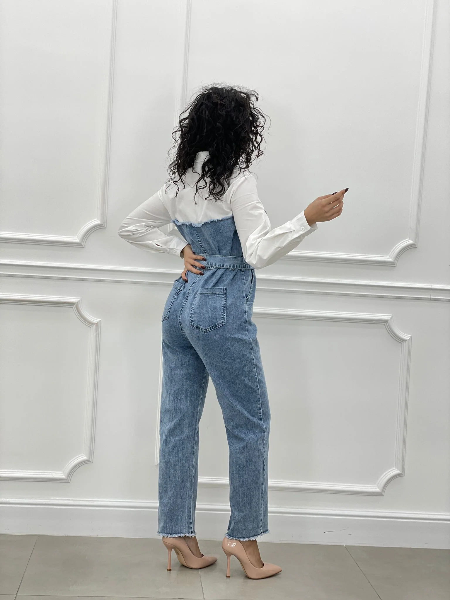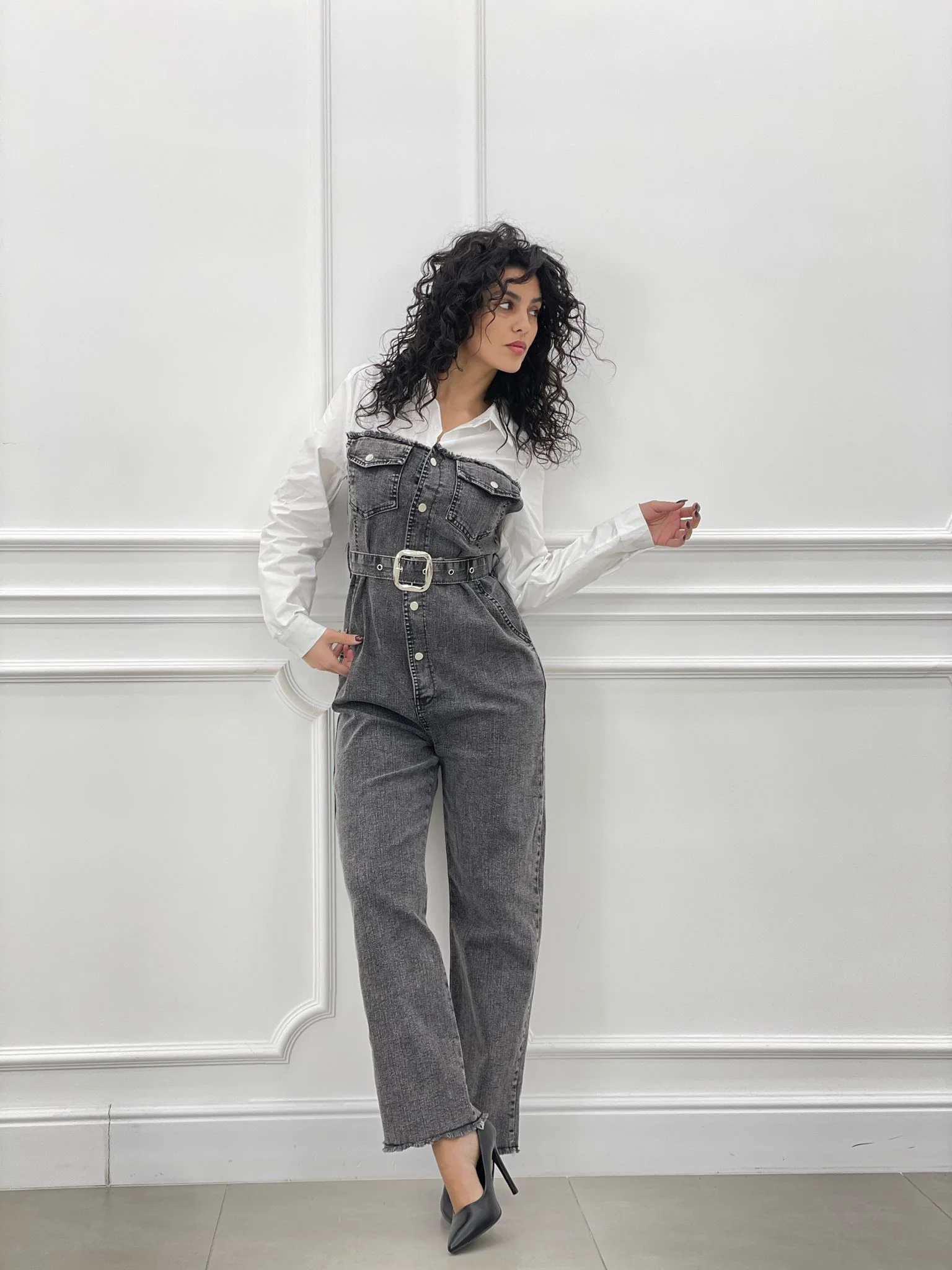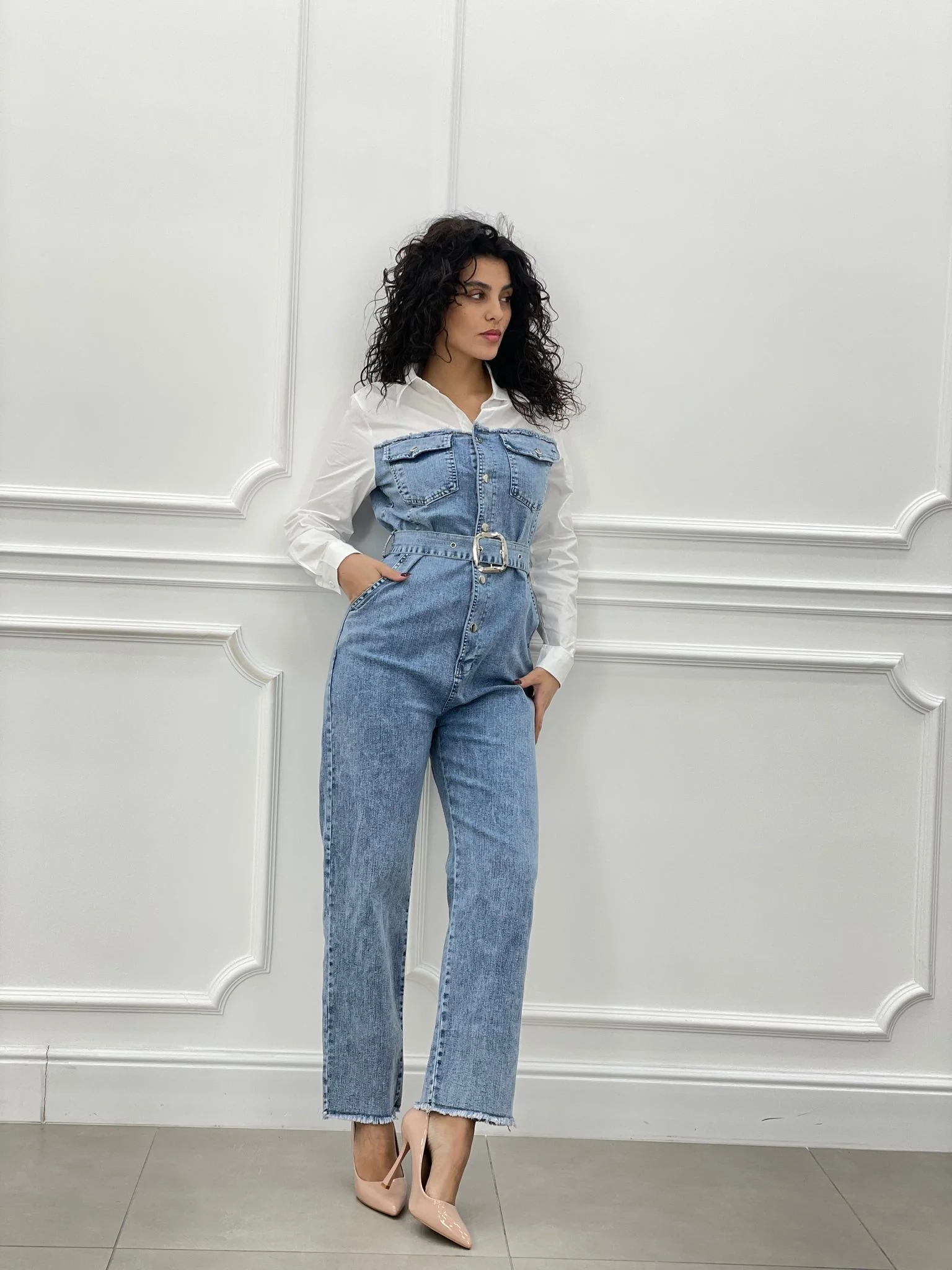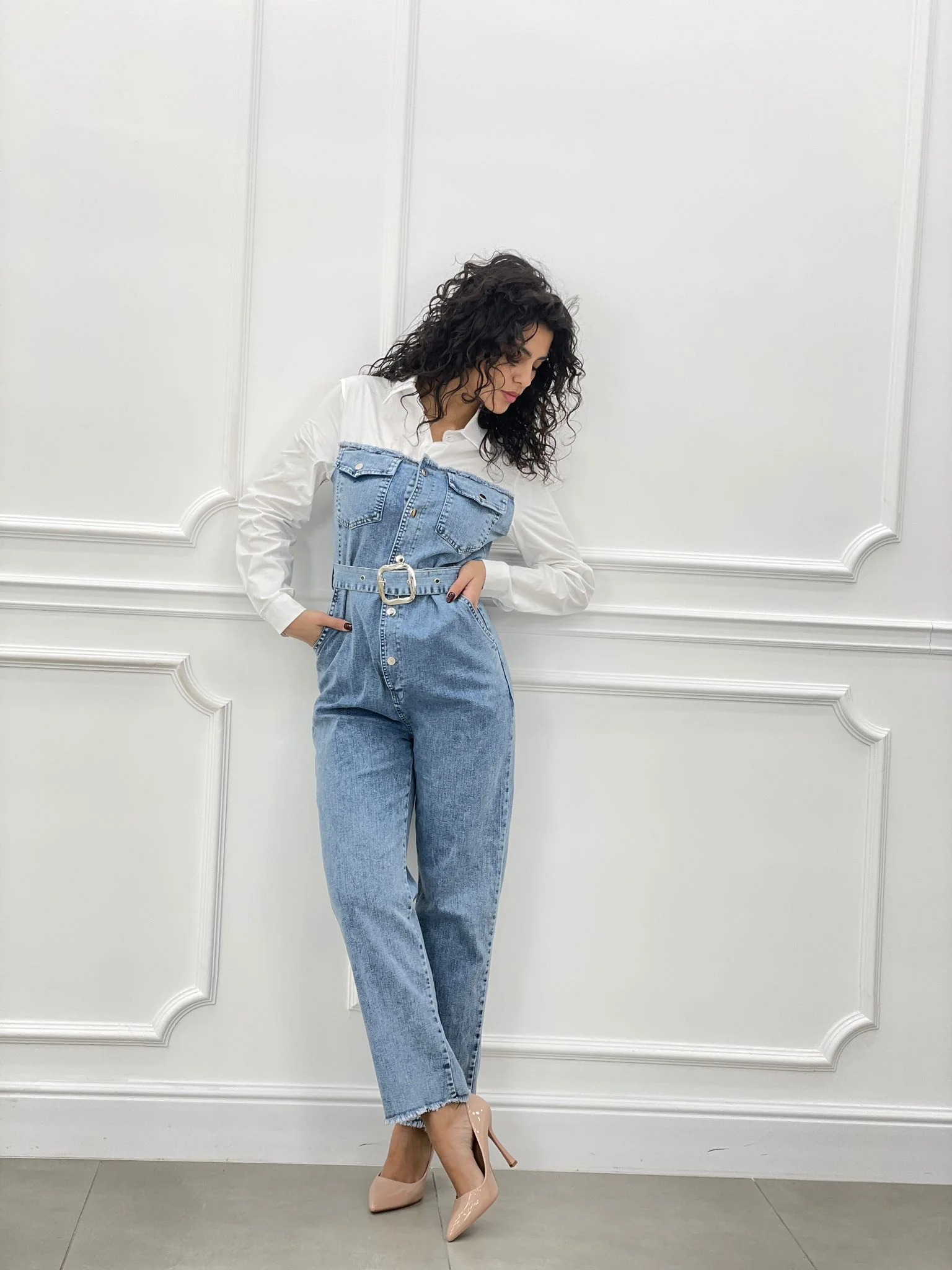 Tuta denim con camicia,cintura bottoni e tasche
