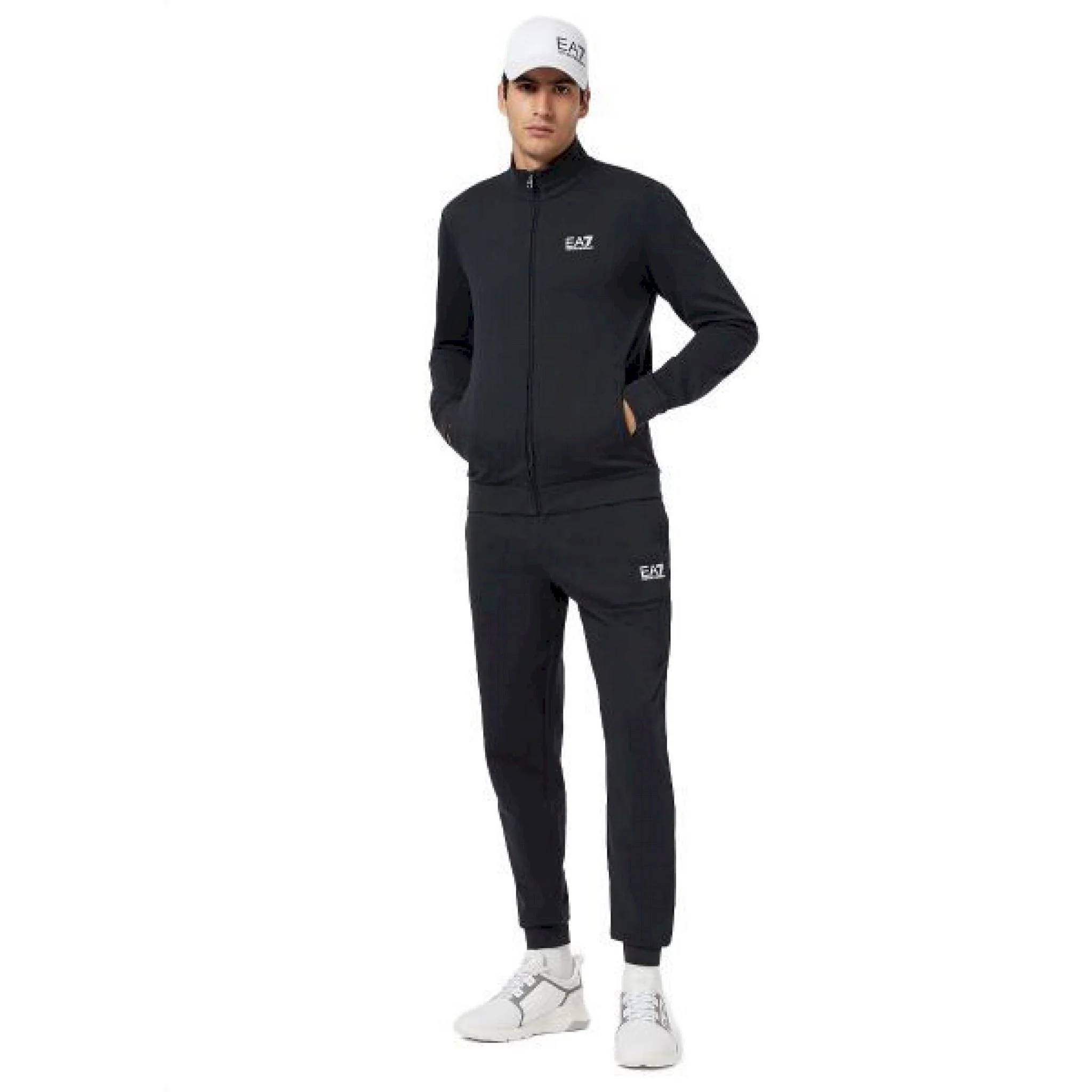 Giacca dal fit regular con collo bomber, polsini e bordo al fondo rifiniti con costine, tasche verticali, chiusura con zip e logo sul petto. i pantaloni hanno linea affusolata, inserto elastico in vita con coulisse, tasche alla francese e logo sul davanti.