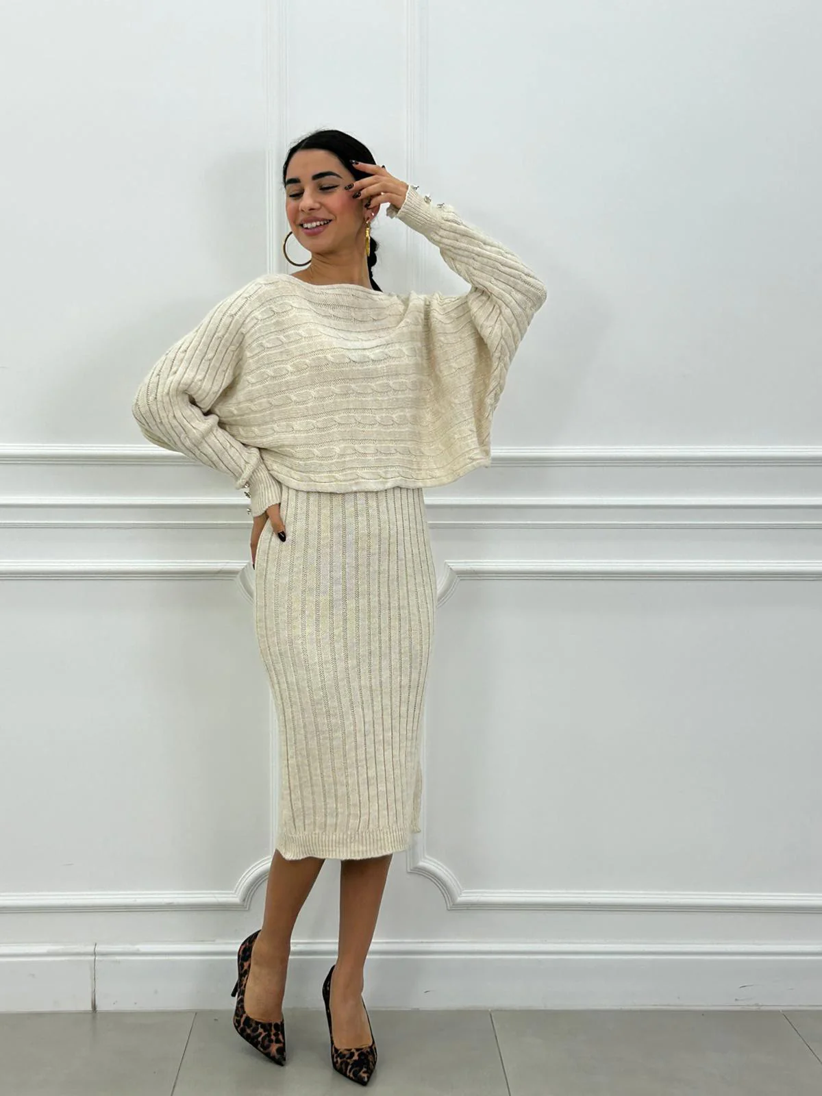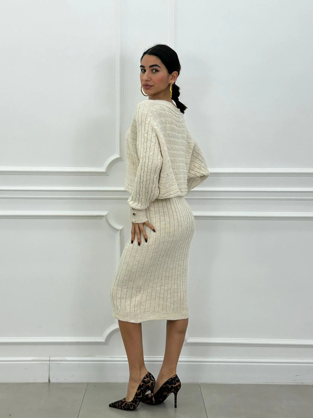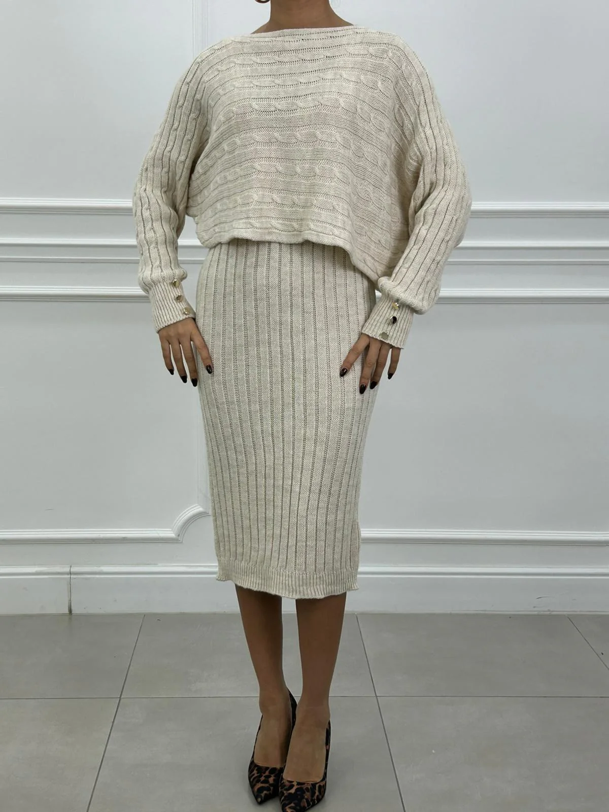 Set in lana maglia con bottoni oro e vestito trama treccia