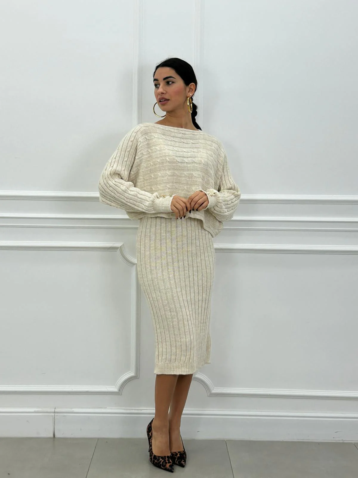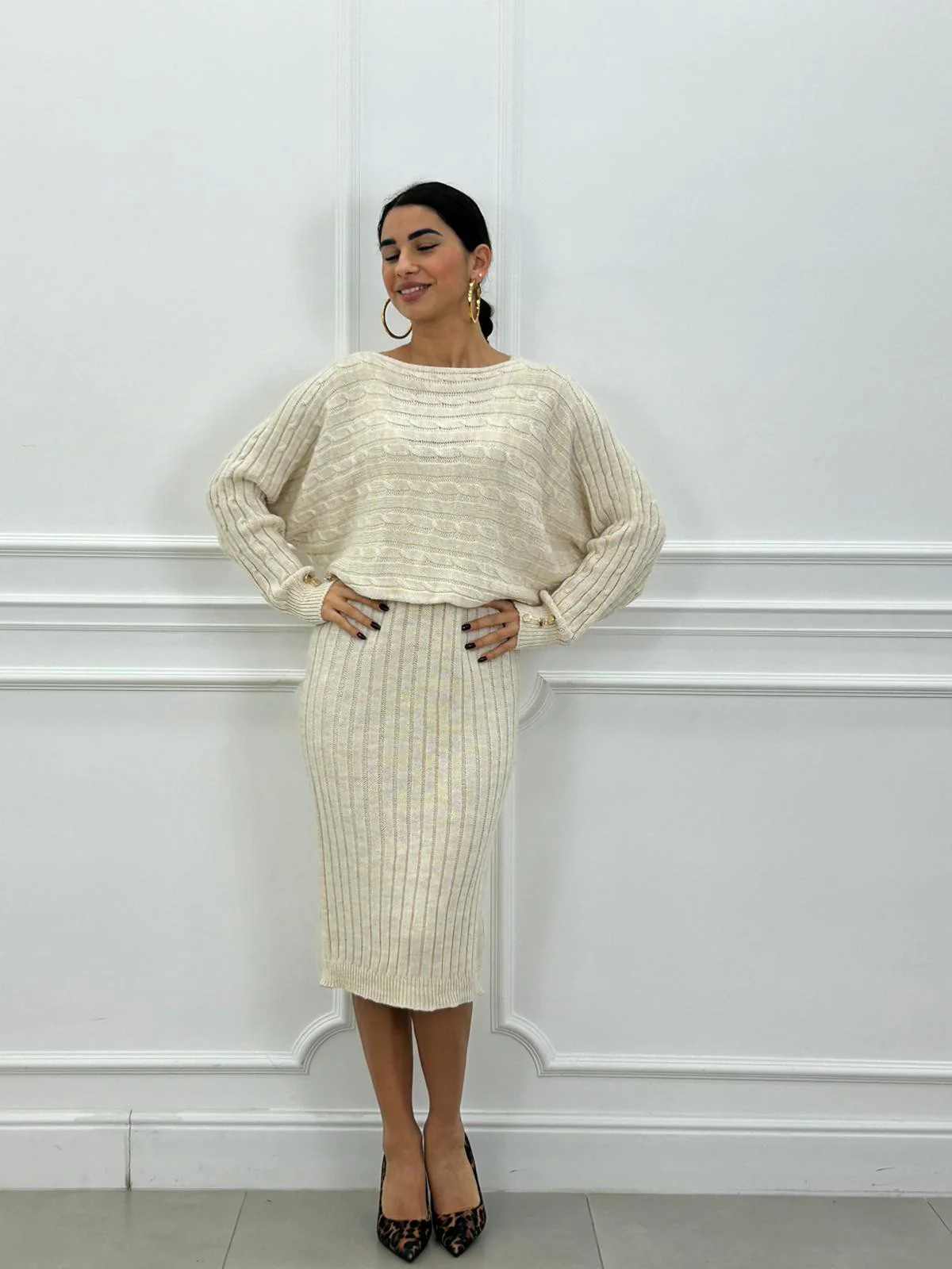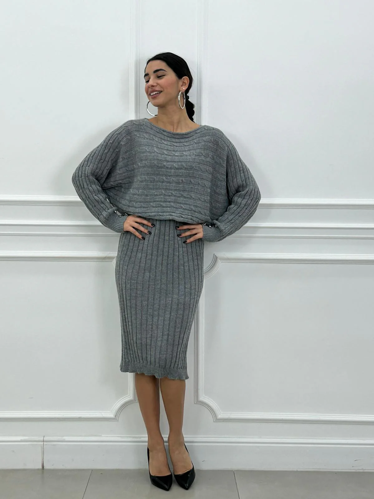 Set in lana maglia con bottoni oro e vestito trama treccia