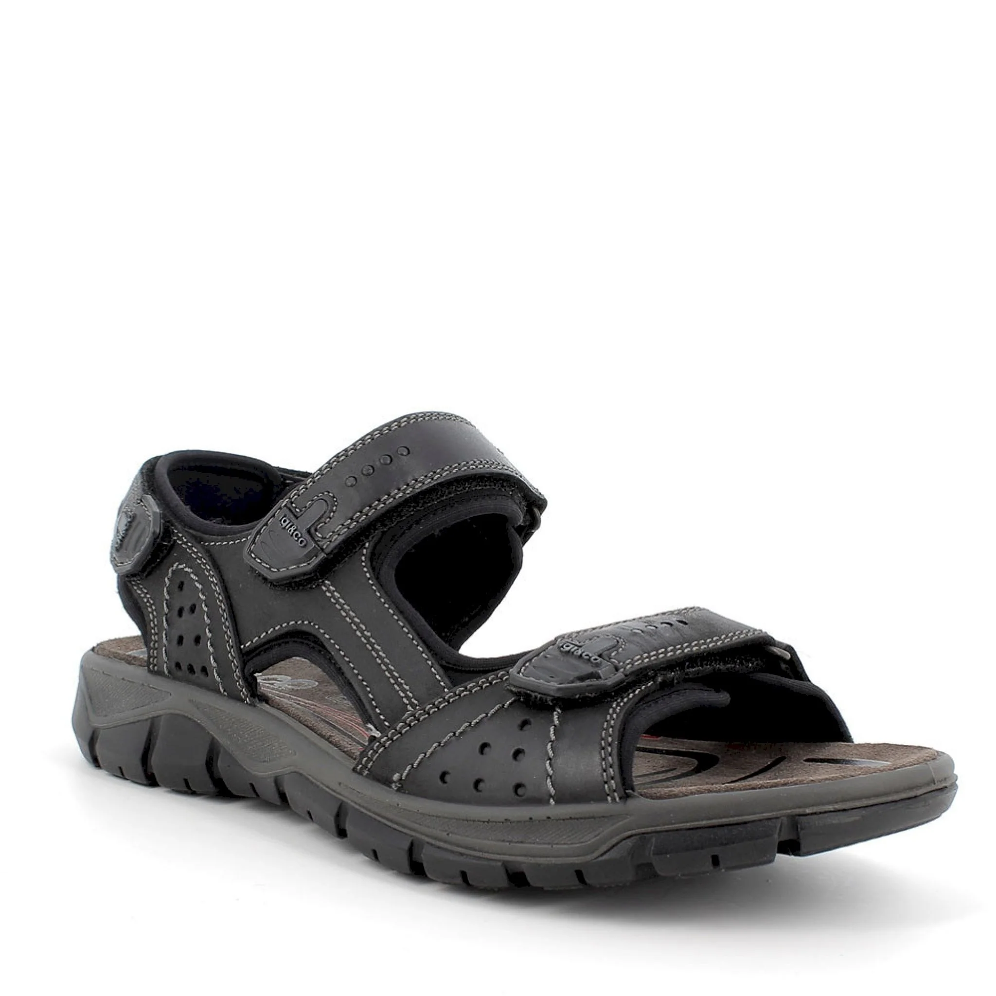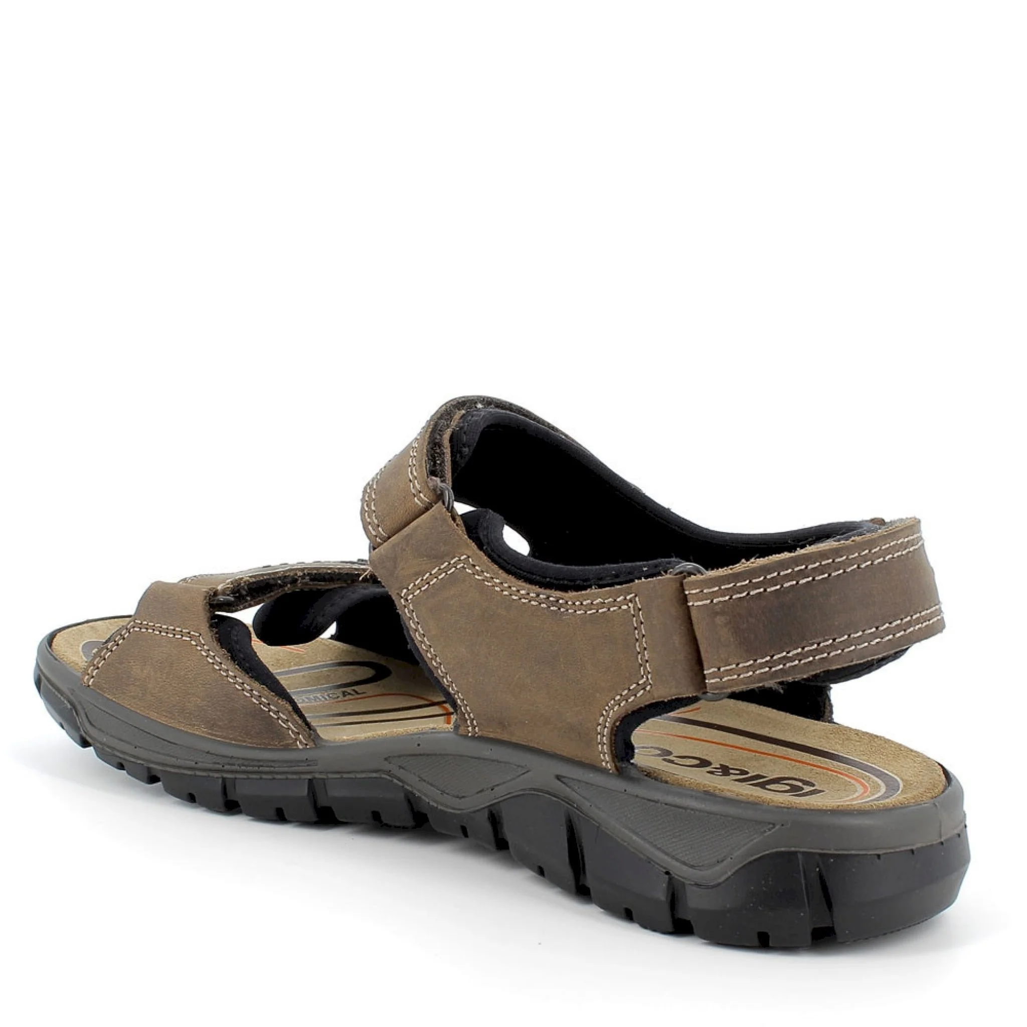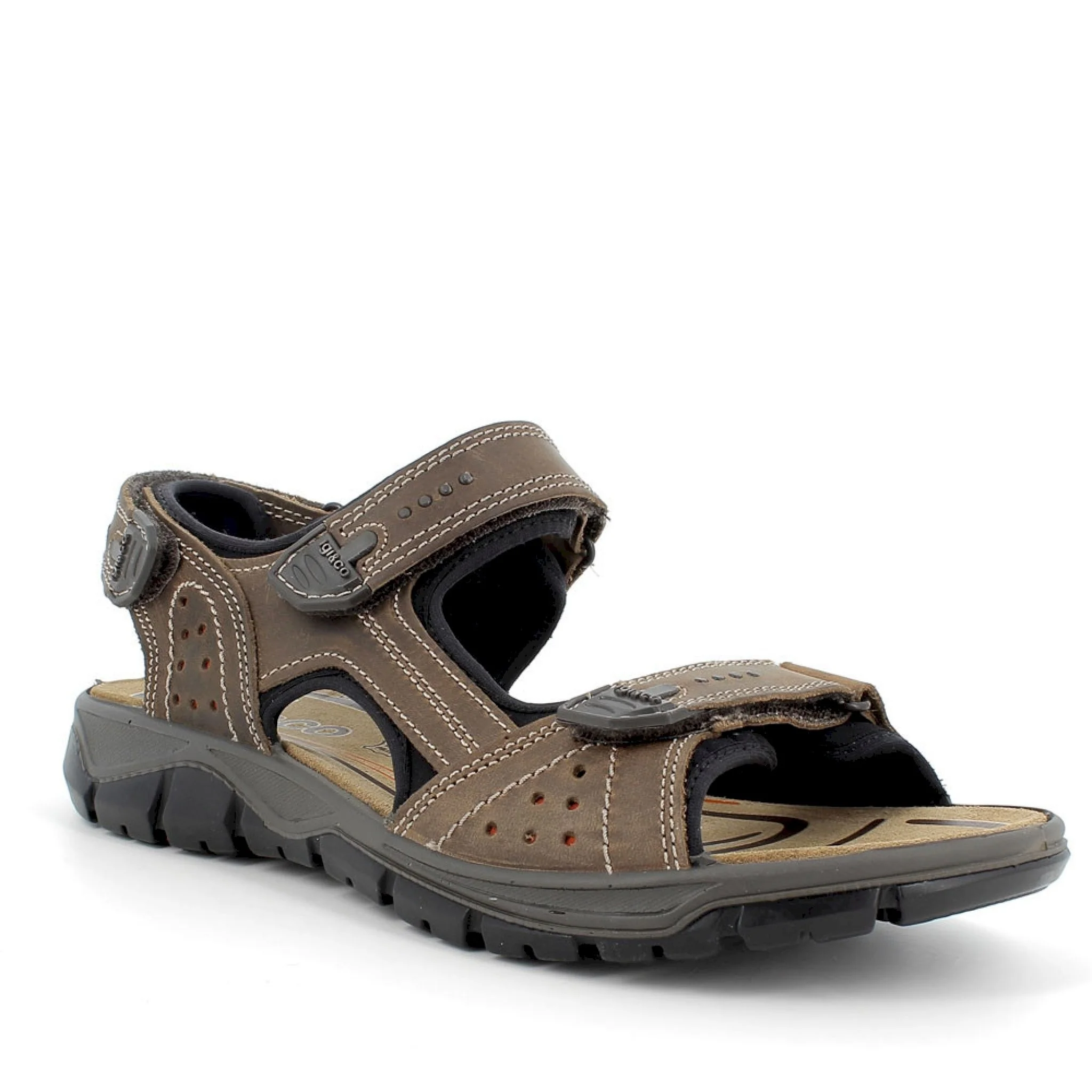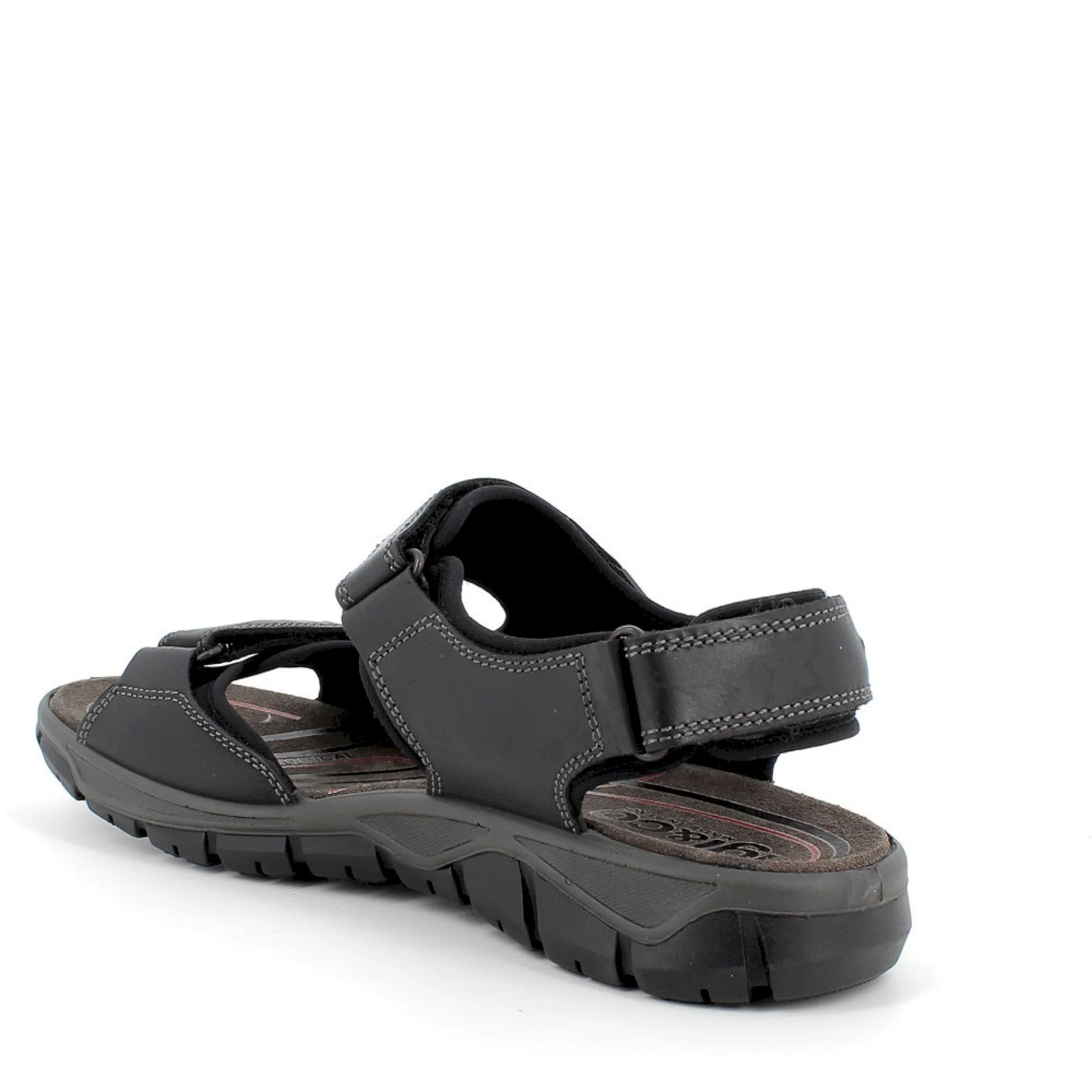Sandalo leggero e pratico in pelle, dotato di triplo cintino per permettere una veloce calzata ed una appropriata regolazione. il sottopiede È rivestito in scamosciato per offrire un appoggio confortevole ed una sensazione di asciutto costante. la particolare ergonomia della suola e il peculiare disegno del battistrada garantiscono flessibilitÀ e trazione.