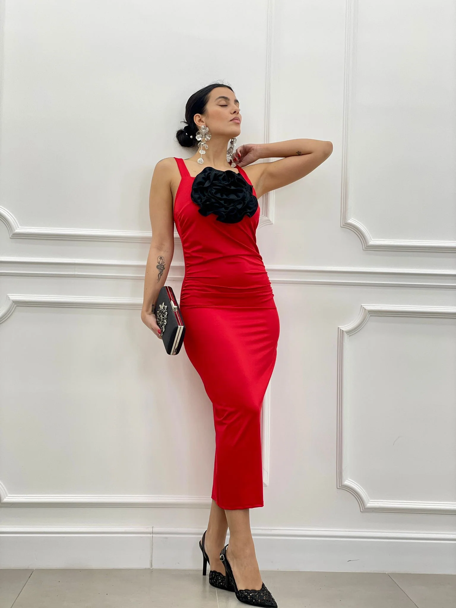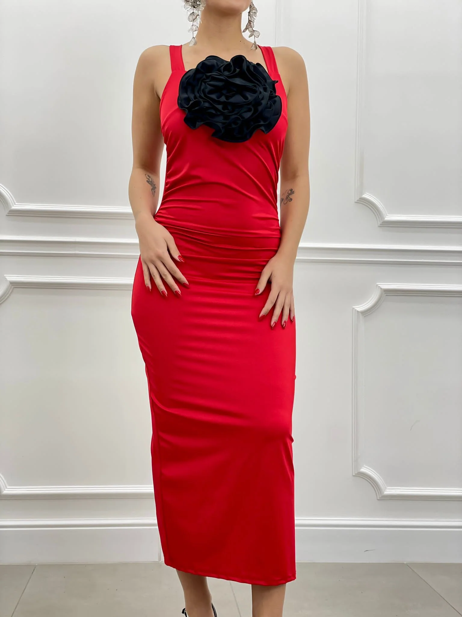 Vestito con fiore drappeggiato con spacco