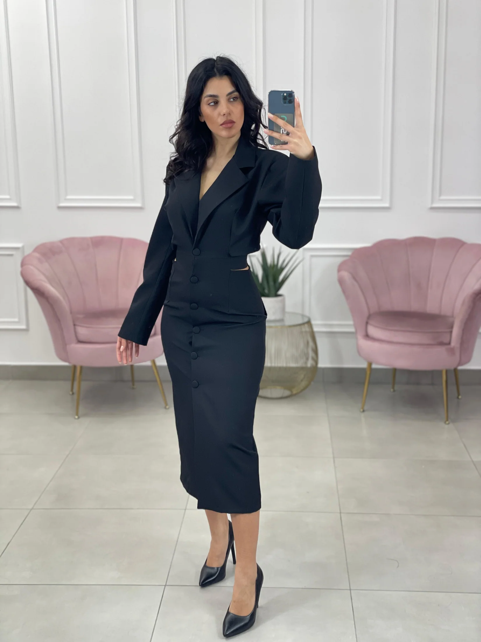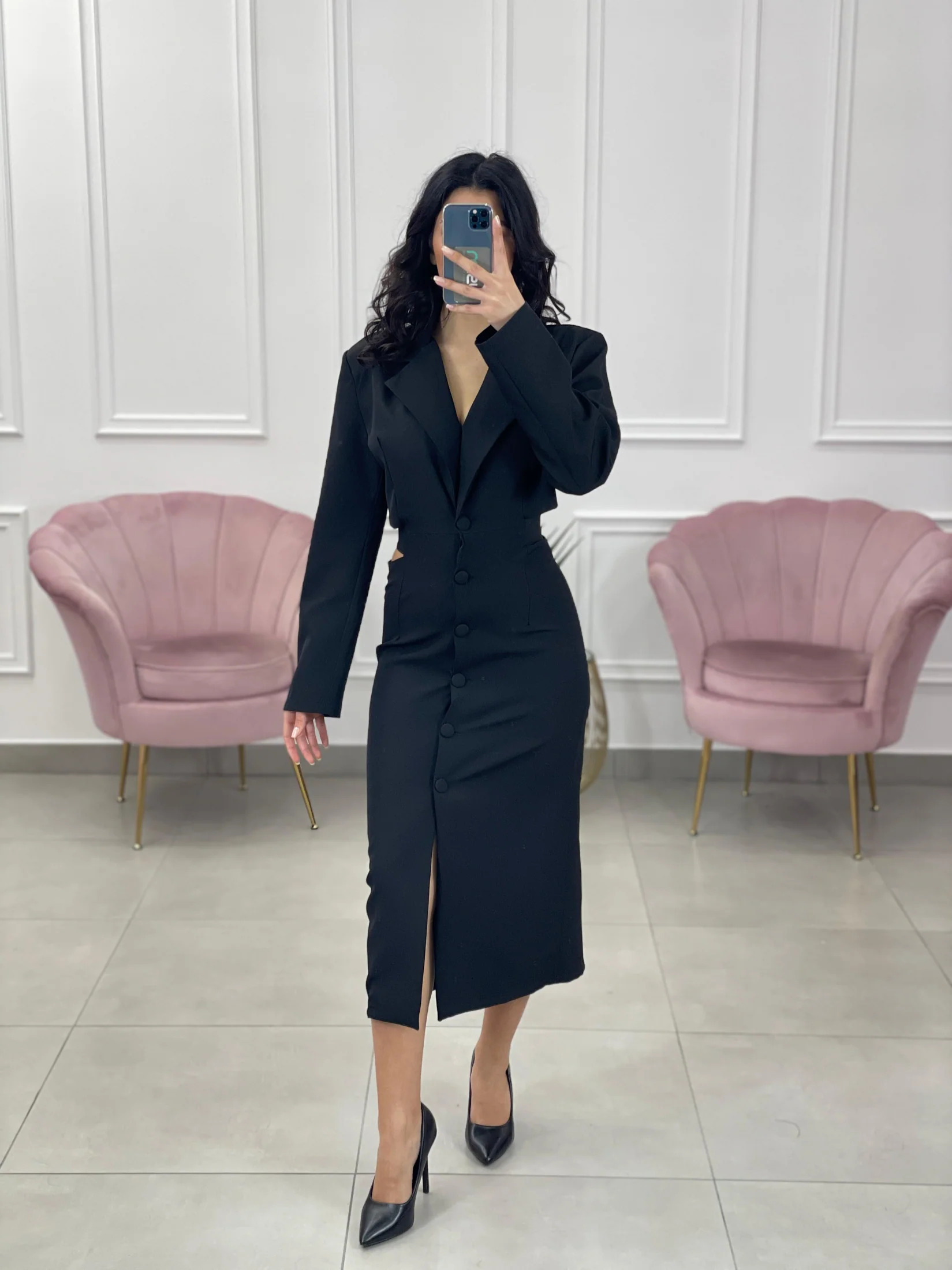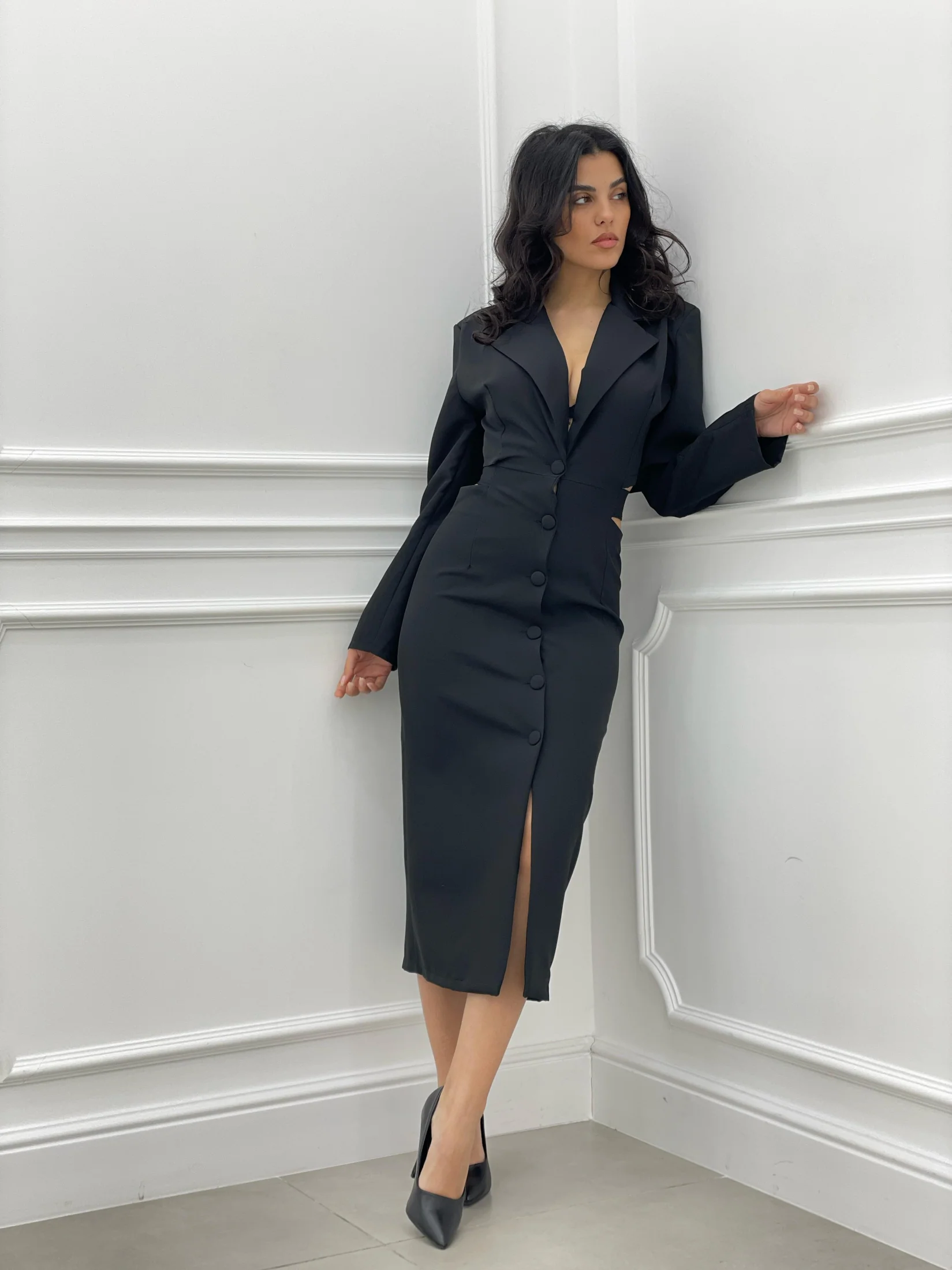Vestito lungo modello giacca , chiusura bottoni e apertura posteriore