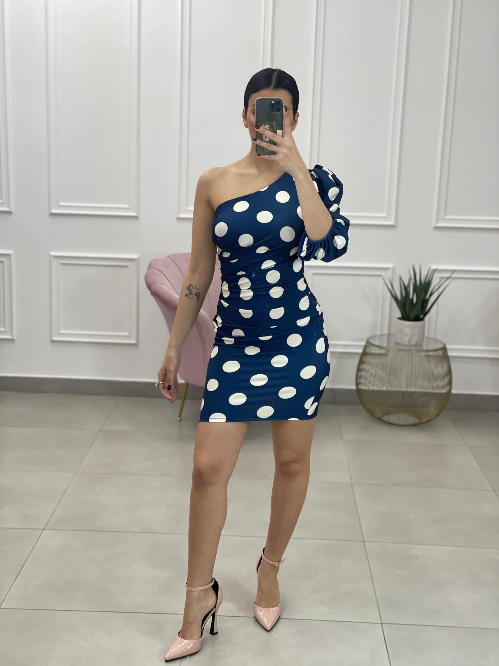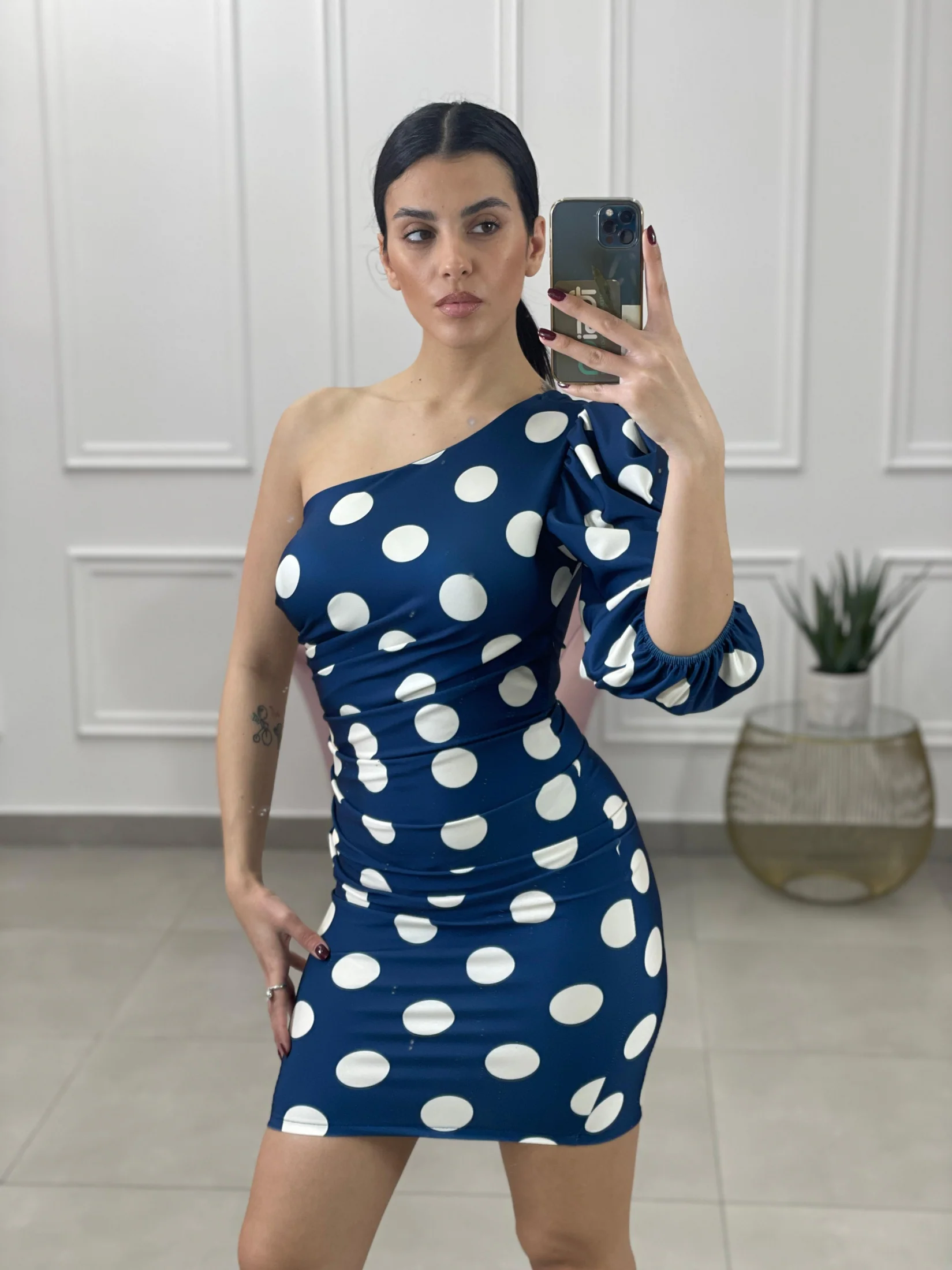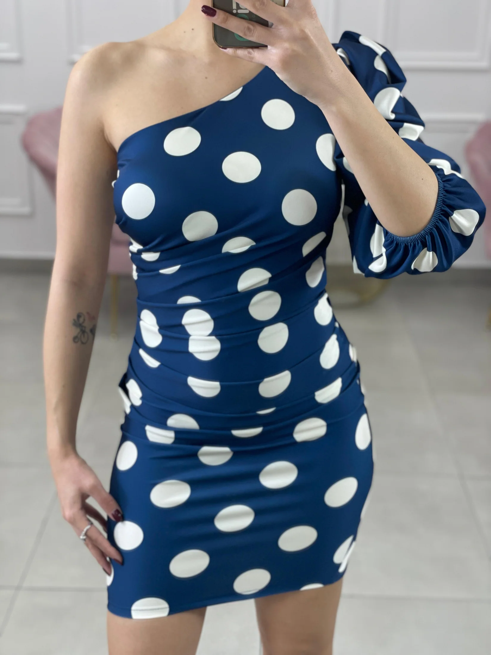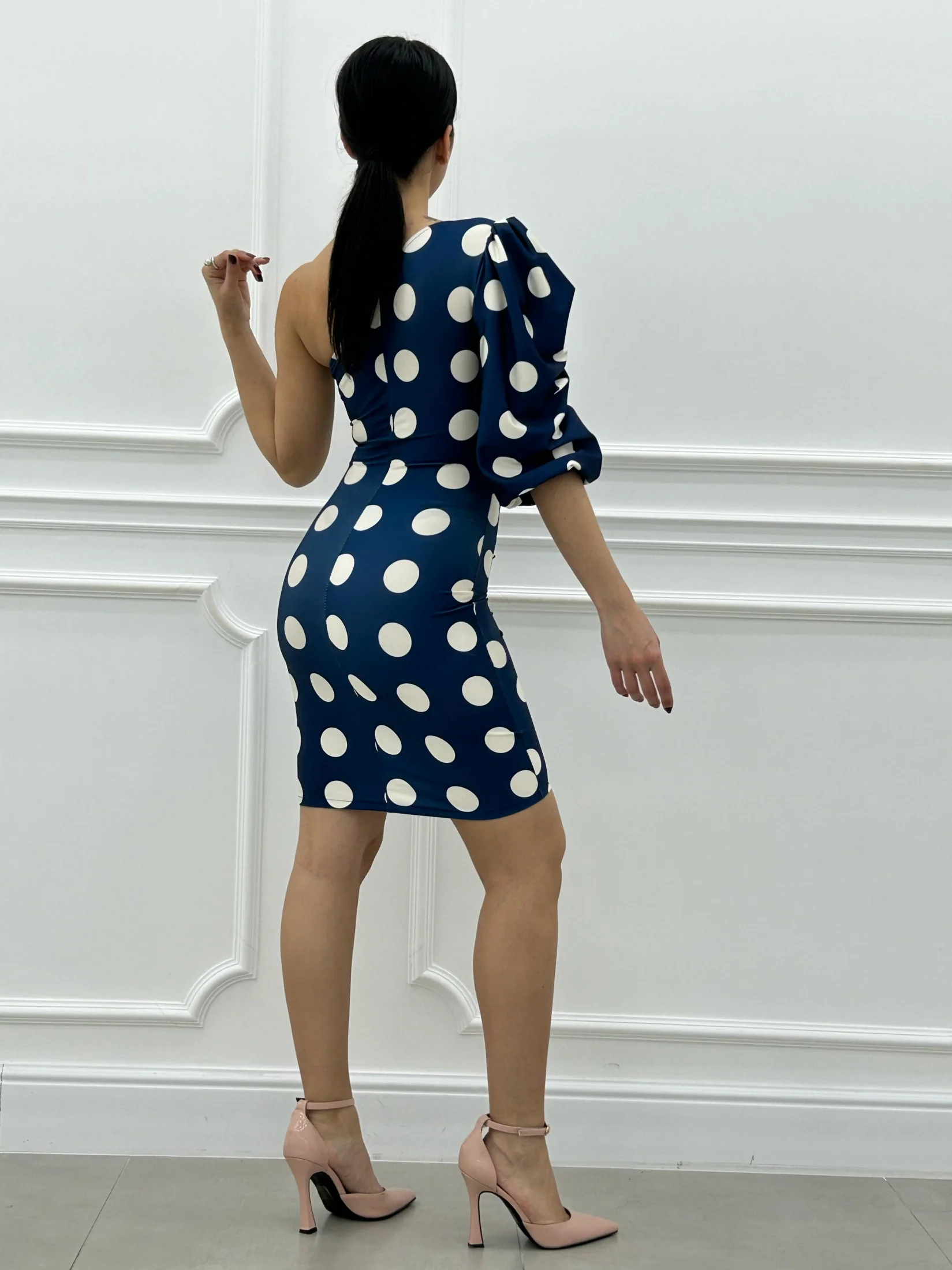 Vestito monospalla fantasia pois